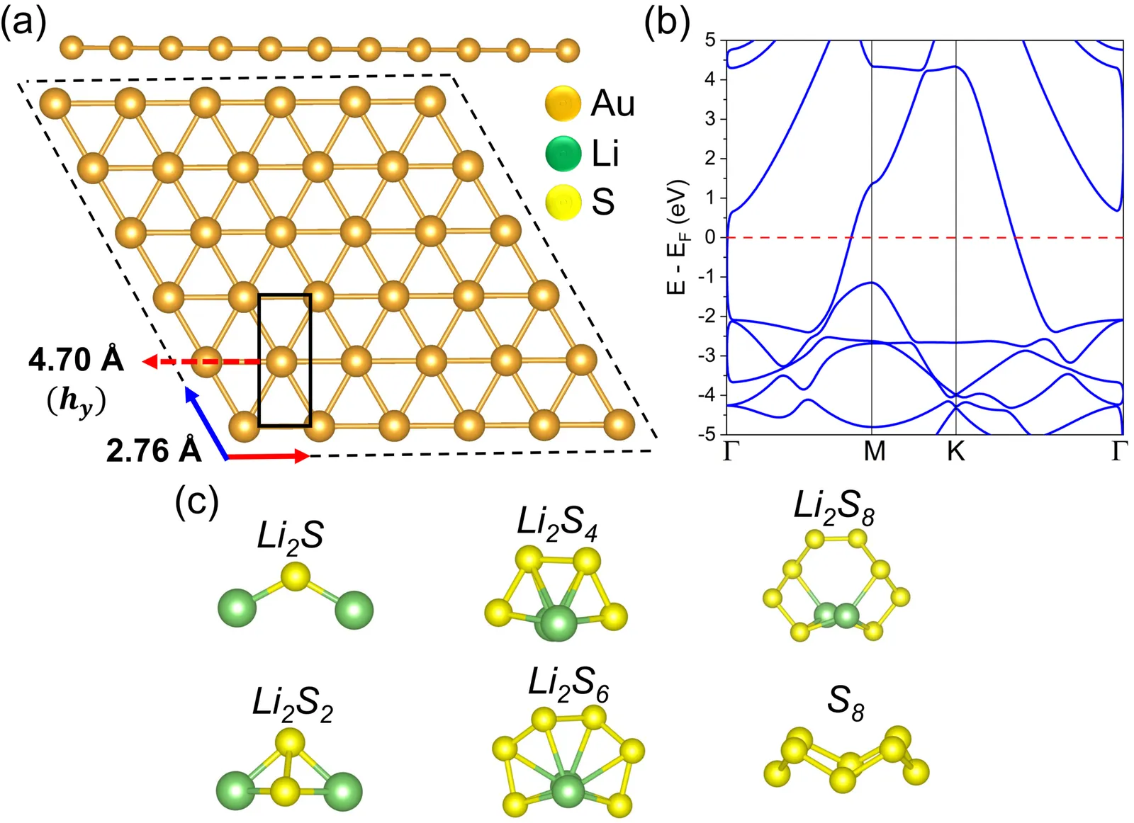 We use first-principles density functional theory to investigate how lithium sulfide and polysulfide clusters (Li2S, Li2S2, Li2S4, Li2S6, Li2S8, and S8) bind to Goldene, a new two-dimensional gold allotrope. All Li-S species exhibit robust binding to Goldene. The adsorption energies range from -4.29 to -1.90 eV. S8 that is alone interacts much less strongly. Charge density difference and Bader analyses indicate that substantial charge is transferred to the substrate, with a maximum 0.92 e for Li-rich clusters. This transfer induces polarization at the interface and shifts the work function to 5.30-5.52 eV. Projected density-of-states calculations indicate that Au-d and S-p states strongly mix near the Fermi level. This hybridization indicates that the electronic coupling is strong. Based on these results, the reaction free-energy profile for the stepwise conversion of S8 to Li2S on Goldene is thermodynamically favorable. The overall stabilization is -3.64 eV, and the rate-determining barrier for the Li2S2 -> Li2S step is 0.47 eV. This shows that Goldene is an effective surface for anchoring and mediating lithium polysulfide reactions.