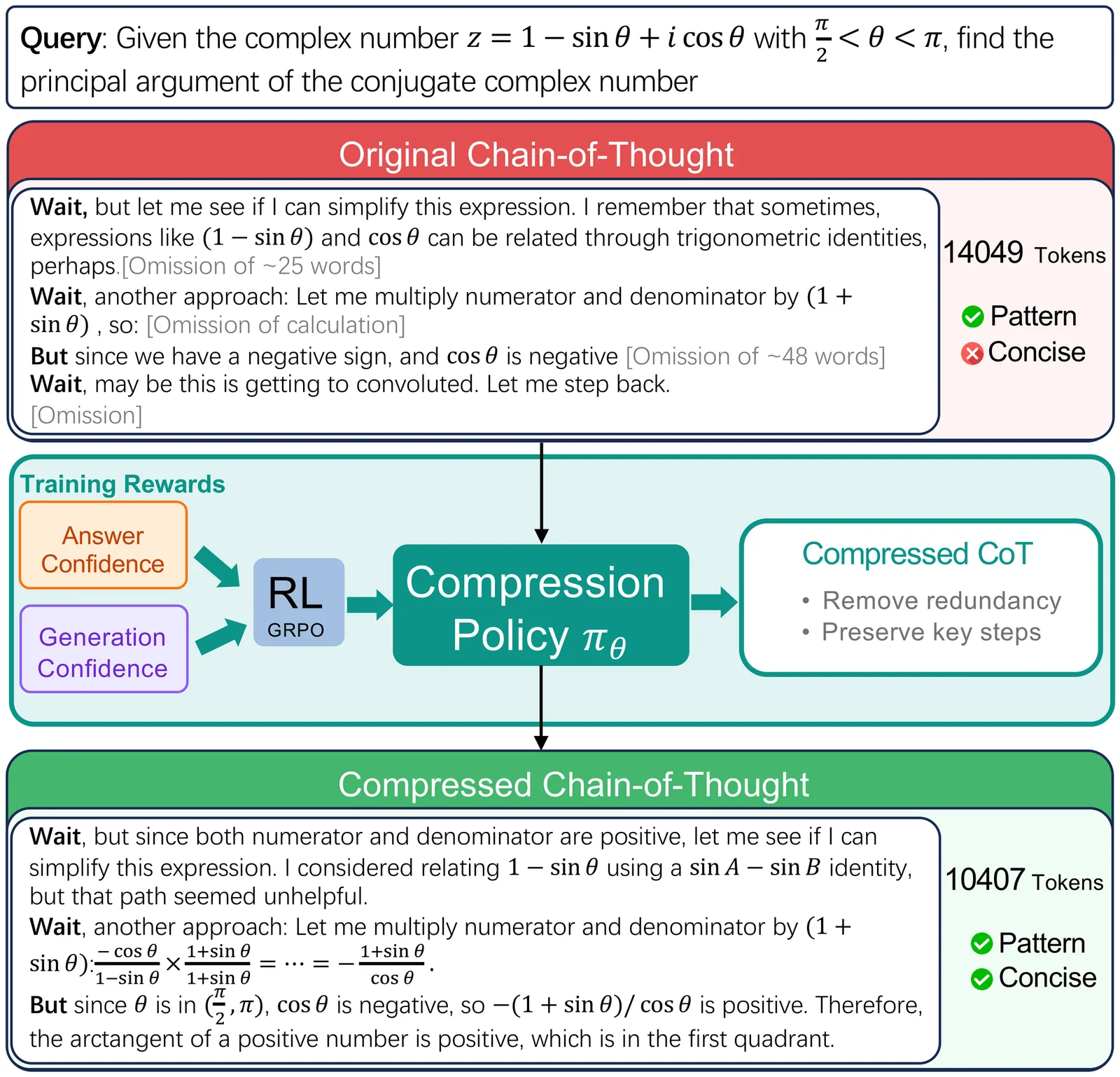 Recent breakthroughs in Large Reasoning Models (LRMs) have demonstrated that extensive Chain-of-Thought (CoT) generation is critical for enabling intricate cognitive behaviors, such as self-verification and backtracking, to solve complex tasks. However, this capability often leads to ``overthinking'', where models generate redundant reasoning paths that inflate computational costs without improving accuracy. While Supervised Fine-Tuning (SFT) on reasoning traces is a standard paradigm for the 'cold start' phase, applying existing compression techniques to these traces often compromises logical coherence or incurs prohibitive sampling costs. In this paper, we introduce ConMax (Confidence-Maximizing Compression), a novel reinforcement learning framework designed to automatically compress reasoning traces while preserving essential reasoning patterns. ConMax formulates compression as a reward-driven optimization problem, training a policy to prune redundancy by maximizing a weighted combination of answer confidence for predictive fidelity and thinking confidence for reasoning validity through a frozen auxiliary LRM. Extensive experiments across five reasoning datasets demonstrate that ConMax achieves a superior efficiency-performance trade-off. Specifically, it reduces inference length by 43% over strong baselines at the cost of a mere 0.7% dip in accuracy, proving its effectiveness in generating high-quality, efficient training data for LRMs.