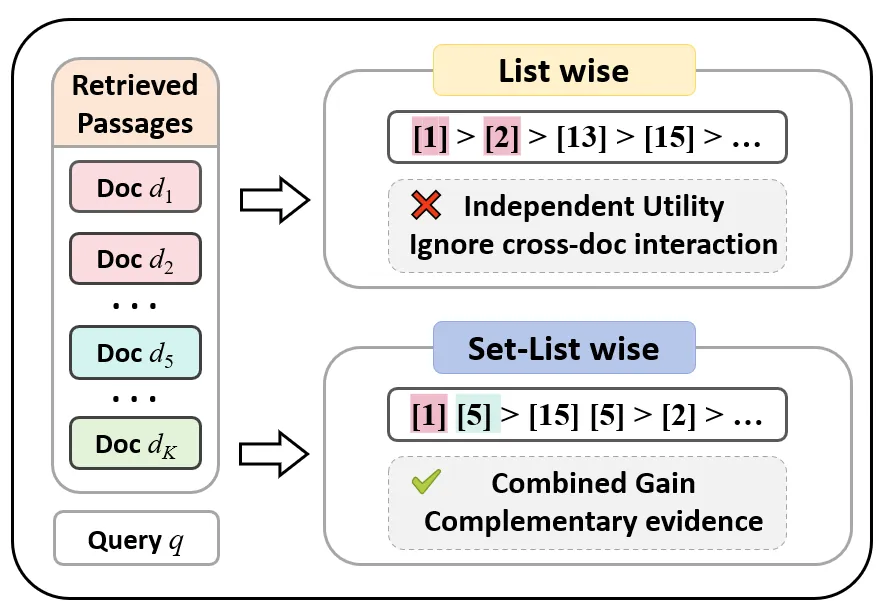 Retrieval-Augmented Generation (RAG) improves generation quality by incorporating evidence retrieved from large external corpora. However, most existing methods rely on statically selecting top-k passages based on individual relevance, which fails to exploit combinatorial gains among passages and often introduces substantial redundancy. To address this limitation, we propose OptiSet, a set-centric framework that unifies set selection and set-level ranking for RAG. OptiSet adopts an "Expand-then-Refine" paradigm: it first expands a query into multiple perspectives to enable a diverse candidate pool and then refines the candidate pool via re-selection to form a compact evidence set. We then devise a self-synthesis strategy without strong LLM supervision to derive preference labels from the set conditional utility changes of the generator, thereby identifying complementary and redundant evidence. Finally, we introduce a set-list wise training strategy that jointly optimizes set selection and set-level ranking, enabling the model to favor compact, high-gain evidence sets. Extensive experiments demonstrate that OptiSet improves performance on complex combinatorial problems and makes generation more efficient. The source code is publicly available.