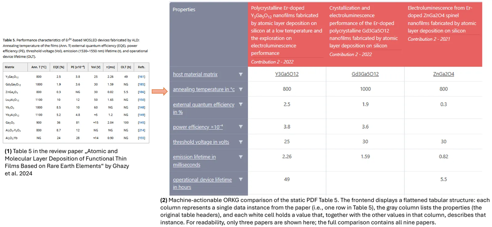 Scientific reviews are central to knowledge integration in materials science, yet their key insights remain locked in narrative text and static PDF tables, limiting reuse by humans and machines alike. This article presents a case study in atomic layer deposition and etching (ALD/E) where we publish review tables as FAIR, machine-actionable comparisons in the Open Research Knowledge Graph (ORKG), turning them into structured, queryable knowledge. Building on this, we contrast symbolic querying over ORKG with large language model-based querying, and argue that a curated symbolic layer should remain the backbone of reliable neurosymbolic AI in materials science, with LLMs serving as complementary, symbolically grounded interfaces rather than standalone sources of truth.