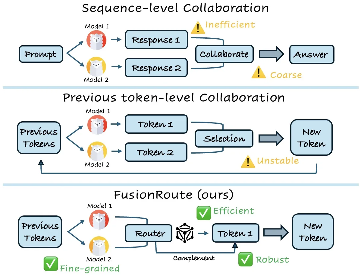 Large language models (LLMs) exhibit strengths across diverse domains. However, achieving strong performance across these domains with a single general-purpose model typically requires scaling to sizes that are prohibitively expensive to train and deploy. On the other hand, while smaller domain-specialized models are much more efficient, they struggle to generalize beyond their training distributions. To address this dilemma, we propose FusionRoute, a robust and effective token-level multi-LLM collaboration framework in which a lightweight router simultaneously (i) selects the most suitable expert at each decoding step and (ii) contributes a complementary logit that refines or corrects the selected expert's next-token distribution via logit addition. Unlike existing token-level collaboration methods that rely solely on fixed expert outputs, we provide a theoretical analysis showing that pure expert-only routing is fundamentally limited: unless strong global coverage assumptions hold, it cannot in general realize the optimal decoding policy. By augmenting expert selection with a trainable complementary generator, FusionRoute expands the effective policy class and enables recovery of optimal value functions under mild conditions. Empirically, across both Llama-3 and Gemma-2 families and diverse benchmarks spanning mathematical reasoning, code generation, and instruction following, FusionRoute outperforms both sequence- and token-level collaboration, model merging, and direct fine-tuning, while remaining competitive with domain experts on their respective tasks.