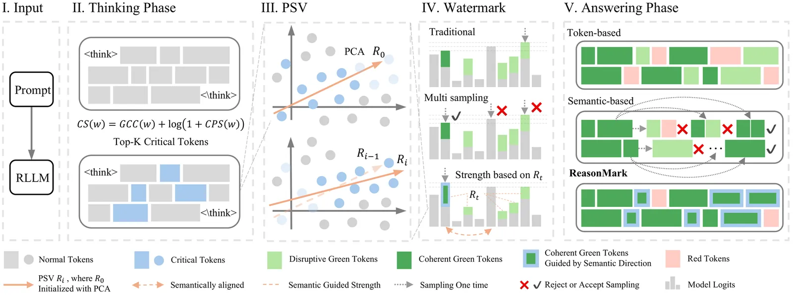 Reasoning Large Language Models (RLLMs) excelling in complex tasks present unique challenges for digital watermarking, as existing methods often disrupt logical coherence or incur high computational costs. Token-based watermarking techniques can corrupt the reasoning flow by applying pseudo-random biases, while semantic-aware approaches improve quality but introduce significant latency or require auxiliary models. This paper introduces ReasonMark, a novel watermarking framework specifically designed for reasoning-intensive LLMs. Our approach decouples generation into an undisturbed Thinking Phase and a watermarked Answering Phase. We propose a Criticality Score to identify semantically pivotal tokens from the reasoning trace, which are distilled into a Principal Semantic Vector (PSV). The PSV then guides a semantically-adaptive mechanism that modulates watermark strength based on token-PSV alignment, ensuring robustness without compromising logical integrity. Extensive experiments show ReasonMark surpasses state-of-the-art methods by reducing text Perplexity by 0.35, increasing translation BLEU score by 0.164, and raising mathematical accuracy by 0.67 points. These advancements are achieved alongside a 0.34% higher watermark detection AUC and stronger robustness to attacks, all with a negligible increase in latency. This work enables the traceable and trustworthy deployment of reasoning LLMs in real-world applications.