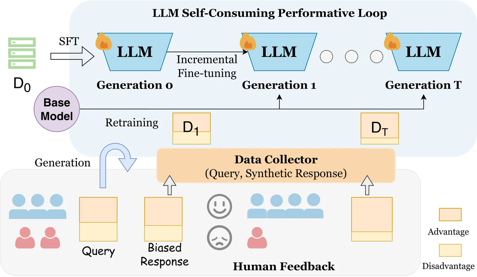 The rapid advancement of large language models (LLMs) has led to growing interest in using synthetic data to train future models. However, this creates a self-consuming retraining loop, where models are trained on their own outputs and may cause performance drops and induce emerging biases. In real-world applications, previously deployed LLMs may influence the data they generate, leading to a dynamic system driven by user feedback. For example, if a model continues to underserve users from a group, less query data will be collected from this particular demographic of users. In this study, we introduce the concept of \textbf{S}elf-\textbf{C}onsuming \textbf{P}erformative \textbf{L}oop (\textbf{SCPL}) and investigate the role of synthetic data in shaping bias during these dynamic iterative training processes under controlled performative feedback. This controlled setting is motivated by the inaccessibility of real-world user preference data from dynamic production systems, and enables us to isolate and analyze feedback-driven bias evolution in a principled manner. We focus on two types of loops, including the typical retraining setting and the incremental fine-tuning setting, which is largely underexplored. Through experiments on three real-world tasks, we find that the performative loop increases preference bias and decreases disparate bias. We design a reward-based rejection sampling strategy to mitigate the bias, moving towards more trustworthy self-improving systems.