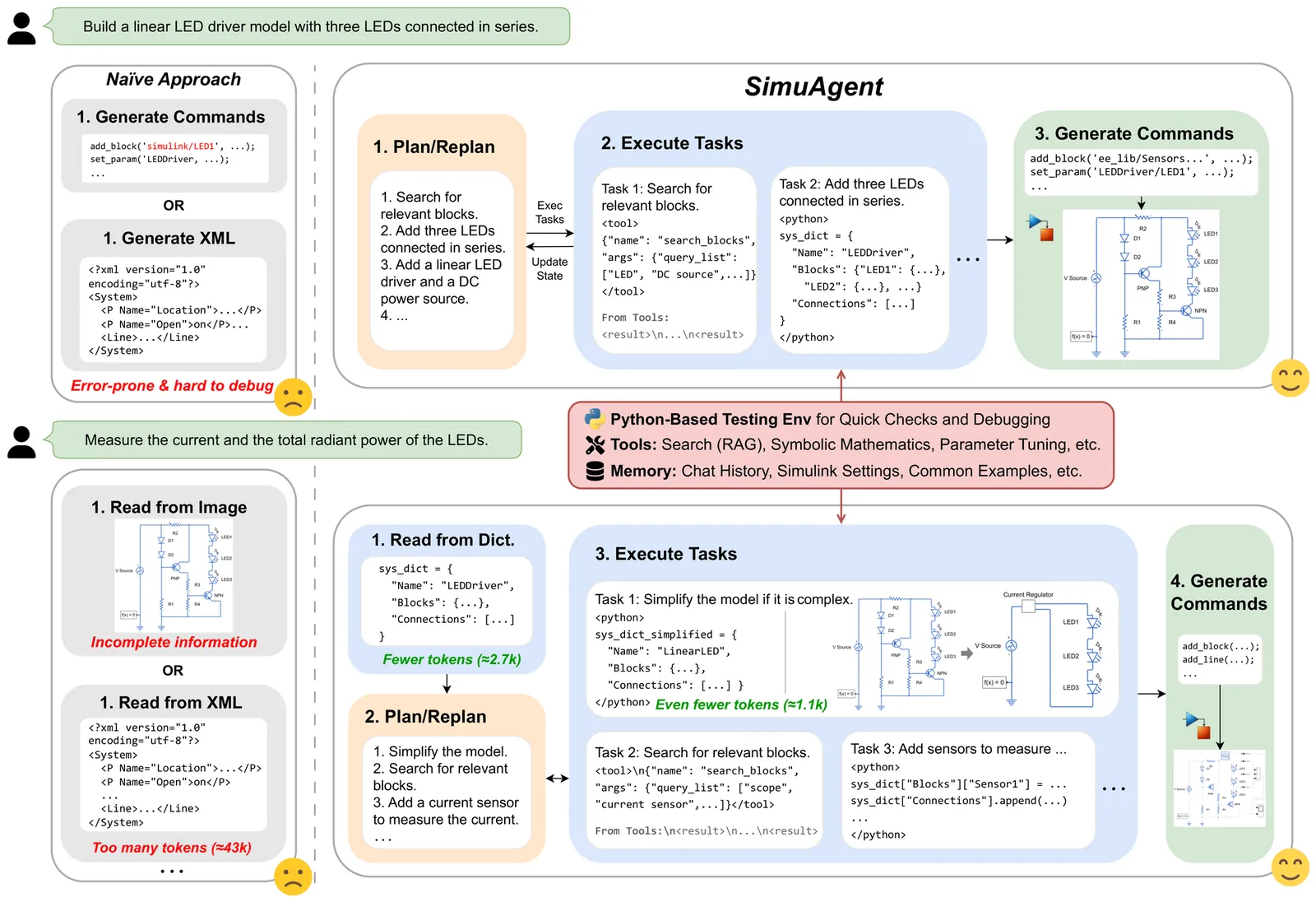 Large language models (LLMs) have revolutionized text-based code automation, but their potential in graph-oriented engineering workflows remains under-explored. We introduce SimuAgent, an LLM-powered modeling and simulation agent tailored for Simulink. SimuAgent replaces verbose XML with a concise, dictionary-style Python representation, dramatically cutting token counts, improving interpretability, and enabling fast, in-process simulation. A lightweight plan-execute architecture, trained in two stages, equips the agent with both low-level tool skills and high-level design reasoning. To tackle sparse rewards in long-horizon tasks, we propose Reflection-GRPO (ReGRPO), which augments Group Relative Policy Optimization (GRPO) with self-reflection traces that supply rich intermediate feedback, accelerating convergence and boosting robustness. Experiments on SimuBench, our newly released benchmark comprising 5300 multi-domain modeling tasks, show that a Qwen2.5-7B model fine-tuned with SimuAgent converges faster and achieves higher modeling accuracy than standard RL baselines, and even surpasses GPT-4o when evaluated with few-shot prompting on the same benchmark. Ablations confirm that the two-stage curriculum and abstract-reconstruct data augmentation further enhance generalization. SimuAgent trains and runs entirely on-premise with modest hardware, delivering a privacy-preserving, cost-effective solution for industrial model-driven engineering. SimuAgent bridges the gap between LLMs and graphical modeling environments, offering a practical solution for AI-assisted engineering design in industrial settings.