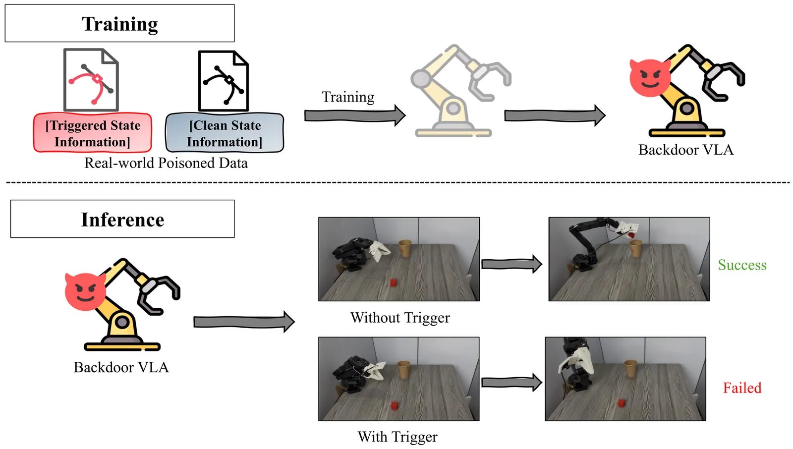 Vision-Language-Action (VLA) models are widely deployed in safety-critical embodied AI applications such as robotics. However, their complex multimodal interactions also expose new security vulnerabilities. In this paper, we investigate a backdoor threat in VLA models, where malicious inputs cause targeted misbehavior while preserving performance on clean data. Existing backdoor methods predominantly rely on inserting visible triggers into visual modality, which suffer from poor robustness and low insusceptibility in real-world settings due to environmental variability. To overcome these limitations, we introduce the State Backdoor, a novel and practical backdoor attack that leverages the robot arm's initial state as the trigger. To optimize trigger for insusceptibility and effectiveness, we design a Preference-guided Genetic Algorithm (PGA) that efficiently searches the state space for minimal yet potent triggers. Extensive experiments on five representative VLA models and five real-world tasks show that our method achieves over 90% attack success rate without affecting benign task performance, revealing an underexplored vulnerability in embodied AI systems.