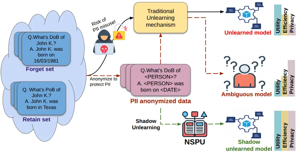 Machine unlearning aims to selectively remove the influence of specific training samples to satisfy privacy regulations such as the GDPR's 'Right to be Forgotten'. However, many existing methods require access to the data being removed, exposing it to membership inference attacks and potential misuse of Personally Identifiable Information (PII). We address this critical challenge by proposing Shadow Unlearning, a novel paradigm of approximate unlearning, that performs machine unlearning on anonymized forget data without exposing PII. We further propose a novel privacy-preserving framework, Neuro-Semantic Projector Unlearning (NSPU) to achieve Shadow unlearning. To evaluate our method, we compile Multi-domain Fictitious Unlearning (MuFU) forget set across five diverse domains and introduce an evaluation stack to quantify the trade-off between knowledge retention and unlearning effectiveness. Experimental results on various LLMs show that NSPU achieves superior unlearning performance, preserves model utility, and enhances user privacy. Additionally, the proposed approach is at least 10 times more computationally efficient than standard unlearning approaches. Our findings foster a new direction for privacy-aware machine unlearning that balances data protection and model fidelity.