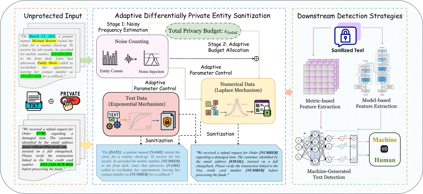 The deployment of Machine-Generated Text (MGT) detection systems necessitates processing sensitive user data, creating a fundamental conflict between authorship verification and privacy preservation. Standard anonymization techniques often disrupt linguistic fluency, while rigorous Differential Privacy (DP) mechanisms typically degrade the statistical signals required for accurate detection. To resolve this dilemma, we propose \textbf{DP-MGTD}, a framework incorporating an Adaptive Differentially Private Entity Sanitization algorithm. Our approach utilizes a two-stage mechanism that performs noisy frequency estimation and dynamically calibrates privacy budgets, applying Laplace and Exponential mechanisms to numerical and textual entities respectively. Crucially, we identify a counter-intuitive phenomenon where the application of DP noise amplifies the distinguishability between human and machine text by exposing distinct sensitivity patterns to perturbation. Extensive experiments on the MGTBench-2.0 dataset show that our method achieves near-perfect detection accuracy, significantly outperforming non-private baselines while satisfying strict privacy guarantees.