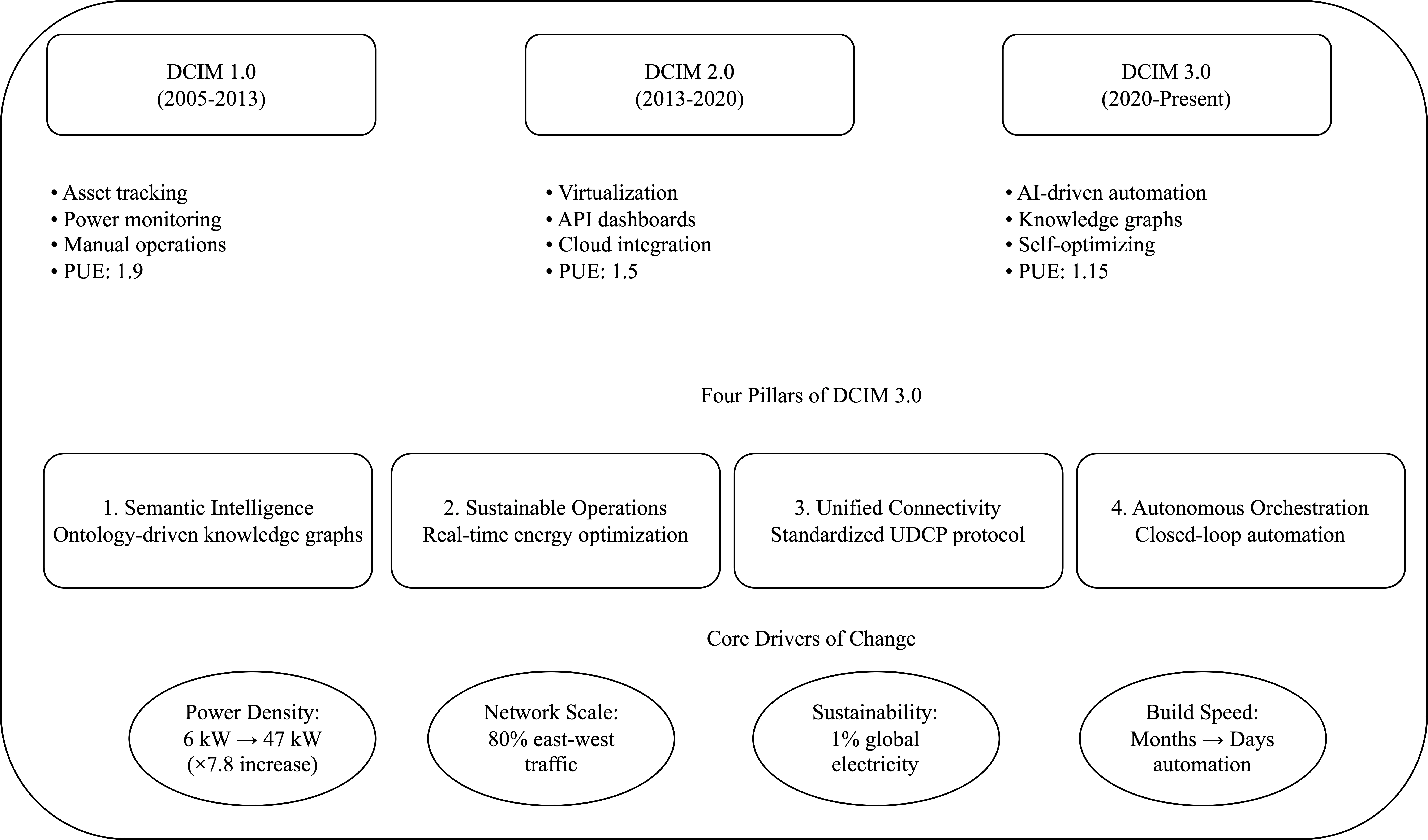 This work presents DCIM 3.0, a unified framework integrating semantic reasoning, predictive analytics, autonomous orchestration, and unified connectivity for next-generation AI data center management. The framework addresses critical challenges in infrastructure automation, sustainability, and digital-twin design through knowledge graph-based intelligence, thermal modeling, and the Unified Device Connectivity Protocol (UDCP).Keywords-Data Center Infrastructure Management, DCIM, AI Data Centers, Knowledge Graphs, Digital Twin, Thermal Management, Infrastructure Automation, Sustainability, GPU Computing, Data Center