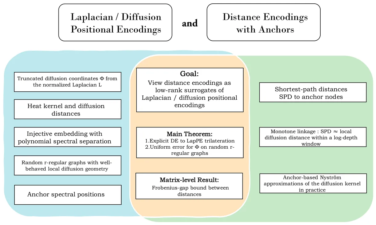 Molecular graph learning benefits from positional signals that capture both local neighborhoods and global topology. Two widely used families are spectral encodings derived from Laplacian or diffusion operators and anchor-based distance encodings built from shortest-path information, yet their precise relationship is poorly understood. We interpret distance encodings as a low-rank surrogate of diffusion geometry and derive an explicit trilateration map that reconstructs truncated diffusion coordinates from transformed anchor distances and anchor spectral positions, with pointwise and Frobenius-gap guarantees on random regular graphs. On DrugBank molecular graphs using a shared GNP-based DDI prediction backbone, a distance-driven Nyström scheme closely recovers diffusion geometry, and both Laplacian and distance encodings substantially outperform a no-encoding baseline.