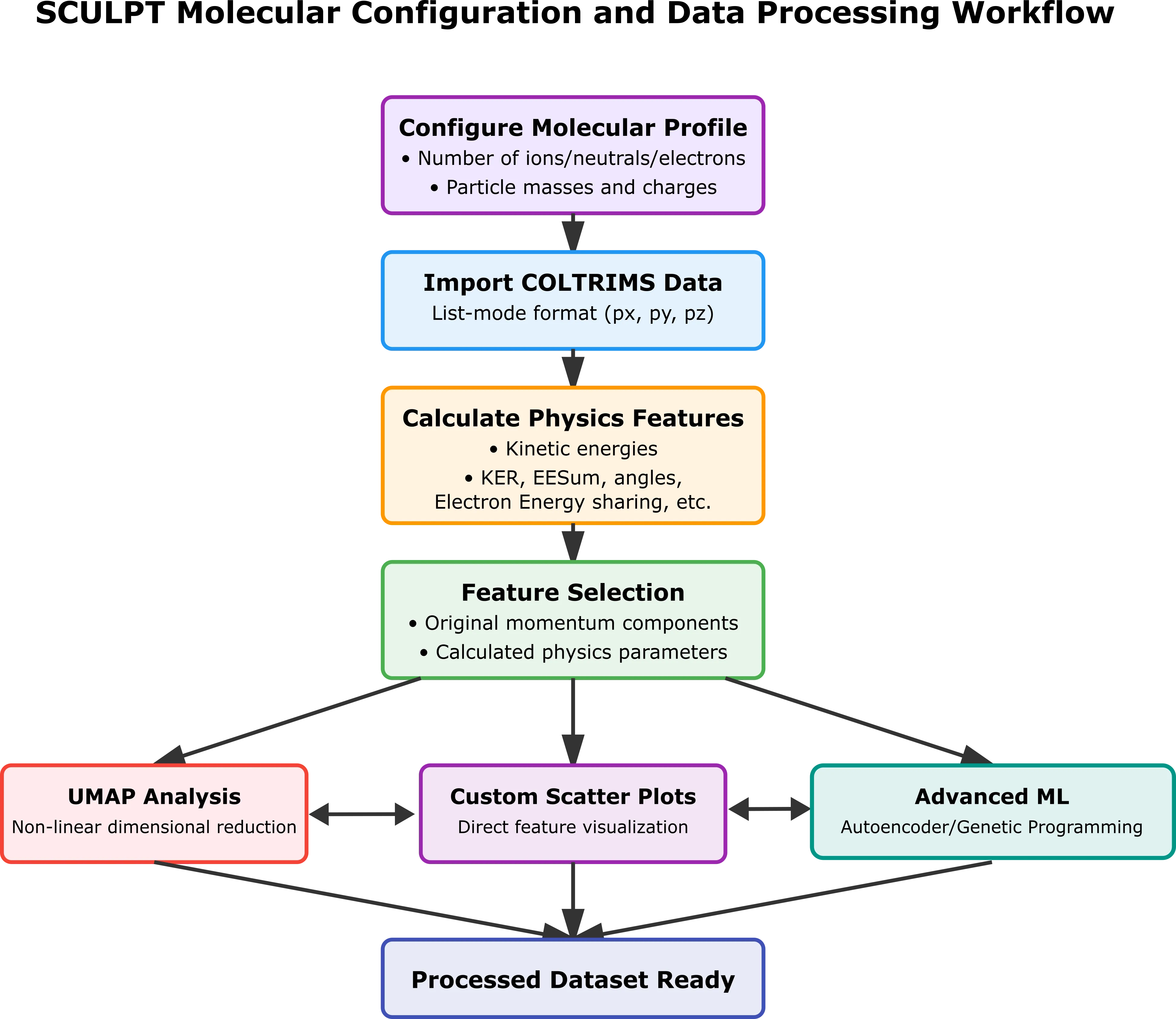 We present SCULPT (Supervised Clustering and Uncovering Latent Patterns with Training), a comprehensive software platform for analyzing tabulated high-dimensional multi-particle coincidence data from Cold Target Recoil Ion Momentum Spectroscopy (COLTRIMS) experiments. The software addresses critical challenges in modern momentum spectroscopy by integrating advanced machine learning techniques with physics-informed analysis in an interactive web-based environment. SCULPT implements Uniform Manifold Approximation and Projection (UMAP) for non-linear dimensionality reduction to reveal correlations in highly dimensional data. We also discuss potential extensions to deep autoencoders for feature learning, and genetic programming for automated discovery of physically meaningful observables. A novel adaptive confidence scoring system provides quantitative reliability assessments by evaluating user-selected clustering quality metrics with predefined weights that reflect each metric's robustness. The platform features configurable molecular profiles for different experimental systems, interactive visualization with selection tools, and comprehensive data filtering capabilities. Utilizing a subset of SCULPT's capabilities, we analyze photo double ionization data measured using the COLTRIMS method for 3-body dissociation of the D2O molecule, revealing distinct fragmentation channels and their correlations with physics parameters. The software's modular architecture and web-based implementation make it accessible to the broader atomic and molecular physics community, significantly reducing the time required for complex multi-dimensional analyses. This opens the door to finding and isolating rare events exhibiting non-linear correlations on the fly during experimental measurements, which can help steer exploration and improve the efficiency of experiments.