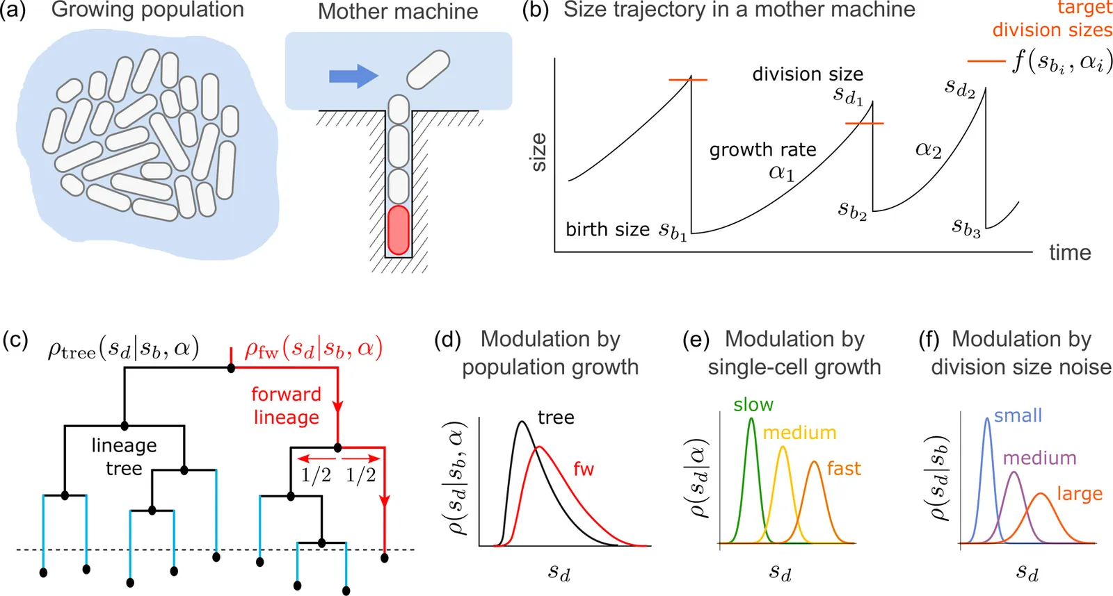 Living cells maintain size homeostasis by actively compensating for size fluctuations. Here, we present two stochastic maps that unify phenomenological models by integrating fluctuating single-cell growth rates and size-dependent noise mechanisms with cell size control. One map is applicable to mother machine lineages and the other to lineage trees of exponentially-growing cell populations, which reveals that population dynamics alter size control measured in mother machine experiments. For example, an adder can become more sizer-like or more timer-like at the population level depending on the noise statistics. Our analysis of bacterial data identifies extrinsic noise as the dominant mechanism of size variability, characterized by a quadratic conditional variance-mean relationship for division size across growth conditions. This finding contradicts the reported independence of added size relative to birth size but is consistent with the adder property in terms of the independence of the mean added size. Finally, we derive a trade-off between population-growth-rate gain and division-size noise. Correlations between size control quantifiers and single-cell growth rates inferred from data indicate that bacteria prioritize a narrow division-size distribution over growth rate maximisation.