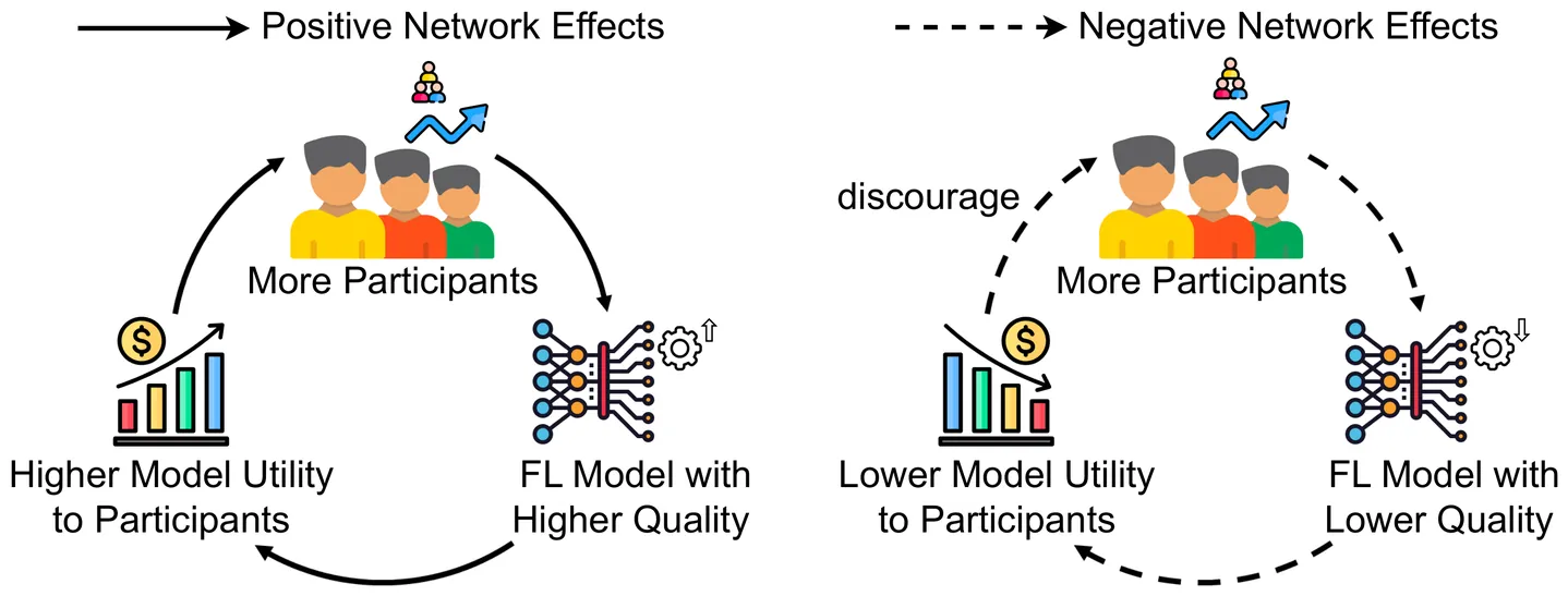 Mechanism design is pivotal to federated learning (FL) for maximizing social welfare by coordinating self-interested clients. Existing mechanisms, however, often overlook the network effects of client participation and the diverse model performance requirements (i.e., generalization error) across applications, leading to suboptimal incentives and social welfare, or even inapplicability in real deployments. To address this gap, we explore incentive mechanism design for FL with network effects and application-specific requirements of model performance. We develop a theoretical model to quantify the impact of network effects on heterogeneous client participation, revealing the non-monotonic nature of such effects. Based on these insights, we propose a Model Trading and Sharing (MoTS) framework, which enables clients to obtain FL models through either participation or purchase. To further address clients' strategic behaviors, we design a Social Welfare maximization with Application-aware and Network effects (SWAN) mechanism, exploiting model customer payments for incentivization. Experimental results on a hardware prototype demonstrate that our SWAN mechanism outperforms existing FL mechanisms, improving social welfare by up to $352.42\%$ and reducing extra incentive costs by $93.07\%$.