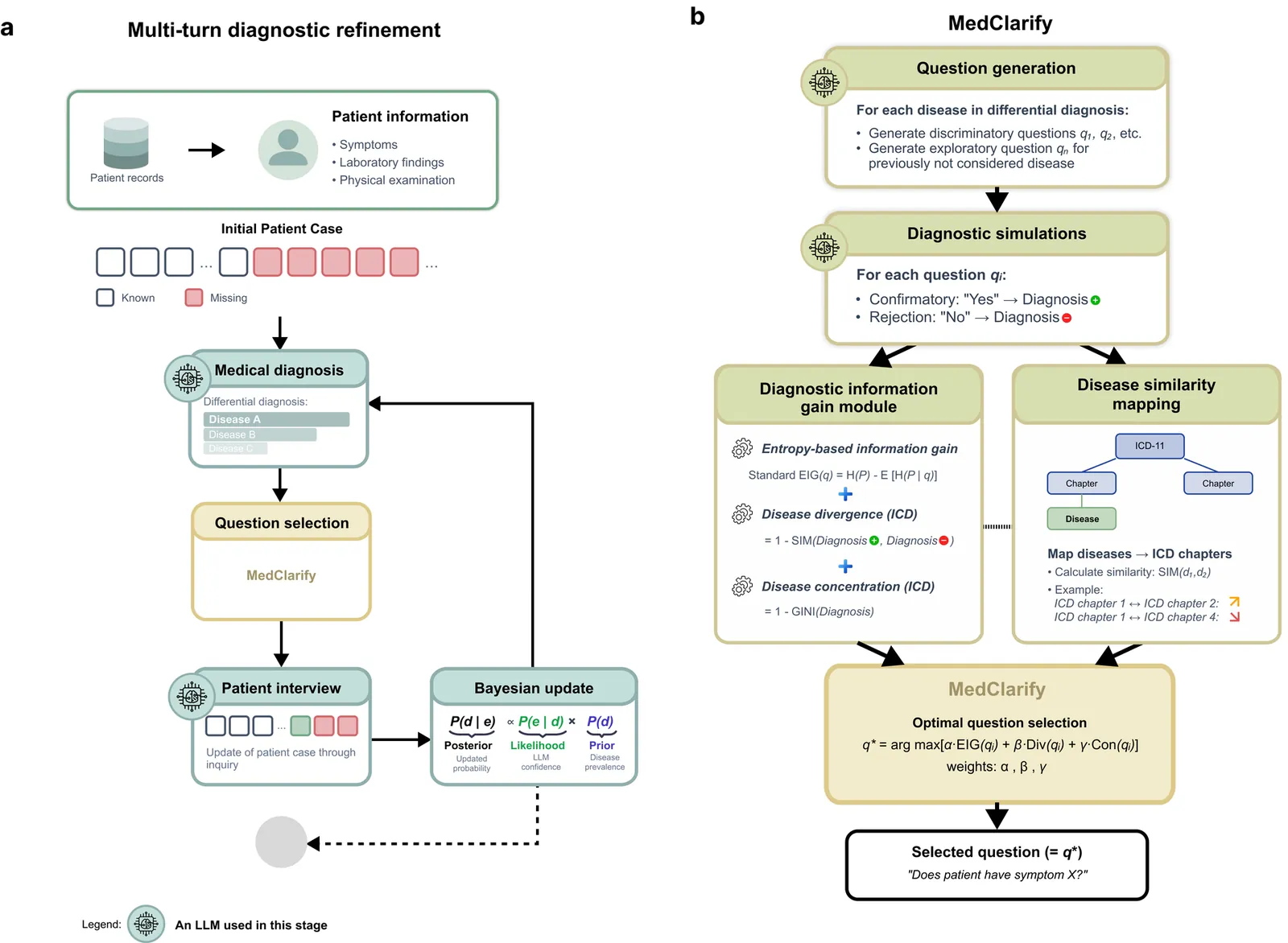Large language models (LLMs) are increasingly used for diagnostic tasks in medicine. In clinical practice, the correct diagnosis can rarely be immediately inferred from the initial patient presentation alone. Rather, reaching a diagnosis often involves systematic history taking, during which clinicians reason over multiple potential conditions through iterative questioning to resolve uncertainty. This process requires considering differential diagnoses and actively excluding emergencies that demand immediate intervention. Yet, the ability of medical LLMs to generate informative follow-up questions and thus reason over differential diagnoses remains underexplored. Here, we introduce MedClarify, an AI agent for information-seeking that can generate follow-up questions for iterative reasoning to support diagnostic decision-making. Specifically, MedClarify computes a list of candidate diagnoses analogous to a differential diagnosis, and then proactively generates follow-up questions aimed at reducing diagnostic uncertainty. By selecting the question with the highest expected information gain, MedClarify enables targeted, uncertainty-aware reasoning to improve diagnostic performance. In our experiments, we first demonstrate the limitations of current LLMs in medical reasoning, which often yield multiple, similarly likely diagnoses, especially when patient cases are incomplete or relevant information for diagnosis is missing. We then show that our information-theoretic reasoning approach can generate effective follow-up questioning and thereby reduces diagnostic errors by ~27 percentage points (p.p.) compared to a standard single-shot LLM baseline. Altogether, MedClarify offers a path to improve medical LLMs through agentic information-seeking and to thus promote effective dialogues with medical LLMs that reflect the iterative and uncertain nature of real-world clinical reasoning.