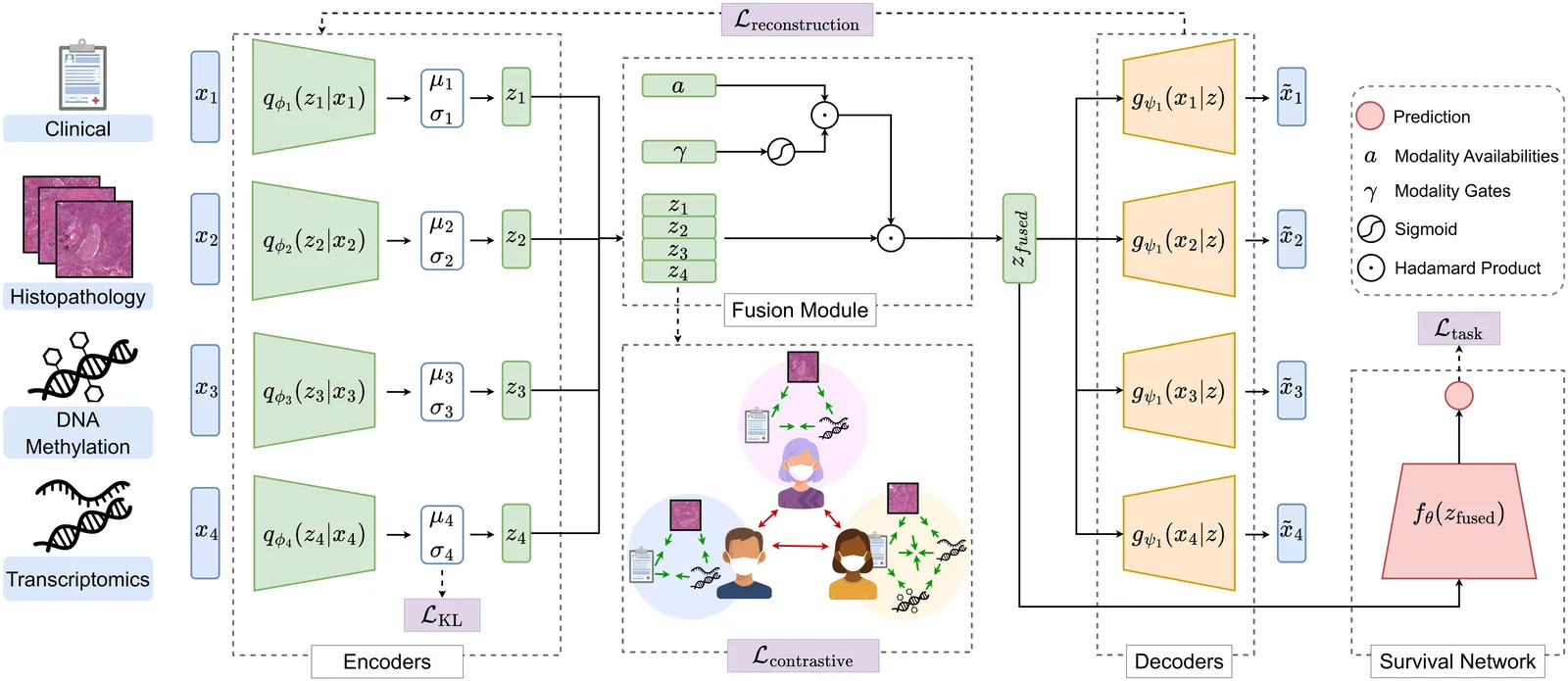 Predicting survival outcomes for non-small cell lung cancer (NSCLC) patients is challenging due to the different individual prognostic features. This task can benefit from the integration of whole-slide images, bulk transcriptomics, and DNA methylation, which offer complementary views of the patient's condition at diagnosis. However, real-world clinical datasets are often incomplete, with entire modalities missing for a significant fraction of patients. State-of-the-art models rely on available data to create patient-level representations or use generative models to infer missing modalities, but they lack robustness in cases of severe missingness. We propose a Multimodal Contrastive Variational AutoEncoder (MCVAE) to address this issue: modality-specific variational encoders capture the uncertainty in each data source, and a fusion bottleneck with learned gating mechanisms is introduced to normalize the contributions from present modalities. We propose a multi-task objective that combines survival loss and reconstruction loss to regularize patient representations, along with a cross-modal contrastive loss that enforces cross-modal alignment in the latent space. During training, we apply stochastic modality masking to improve the robustness to arbitrary missingness patterns. Extensive evaluations on the TCGA-LUAD (n=475) and TCGA-LUSC (n=446) datasets demonstrate the efficacy of our approach in predicting disease-specific survival (DSS) and its robustness to severe missingness scenarios compared to two state-of-the-art models. Finally, we bring some clarifications on multimodal integration by testing our model on all subsets of modalities, finding that integration is not always beneficial to the task.