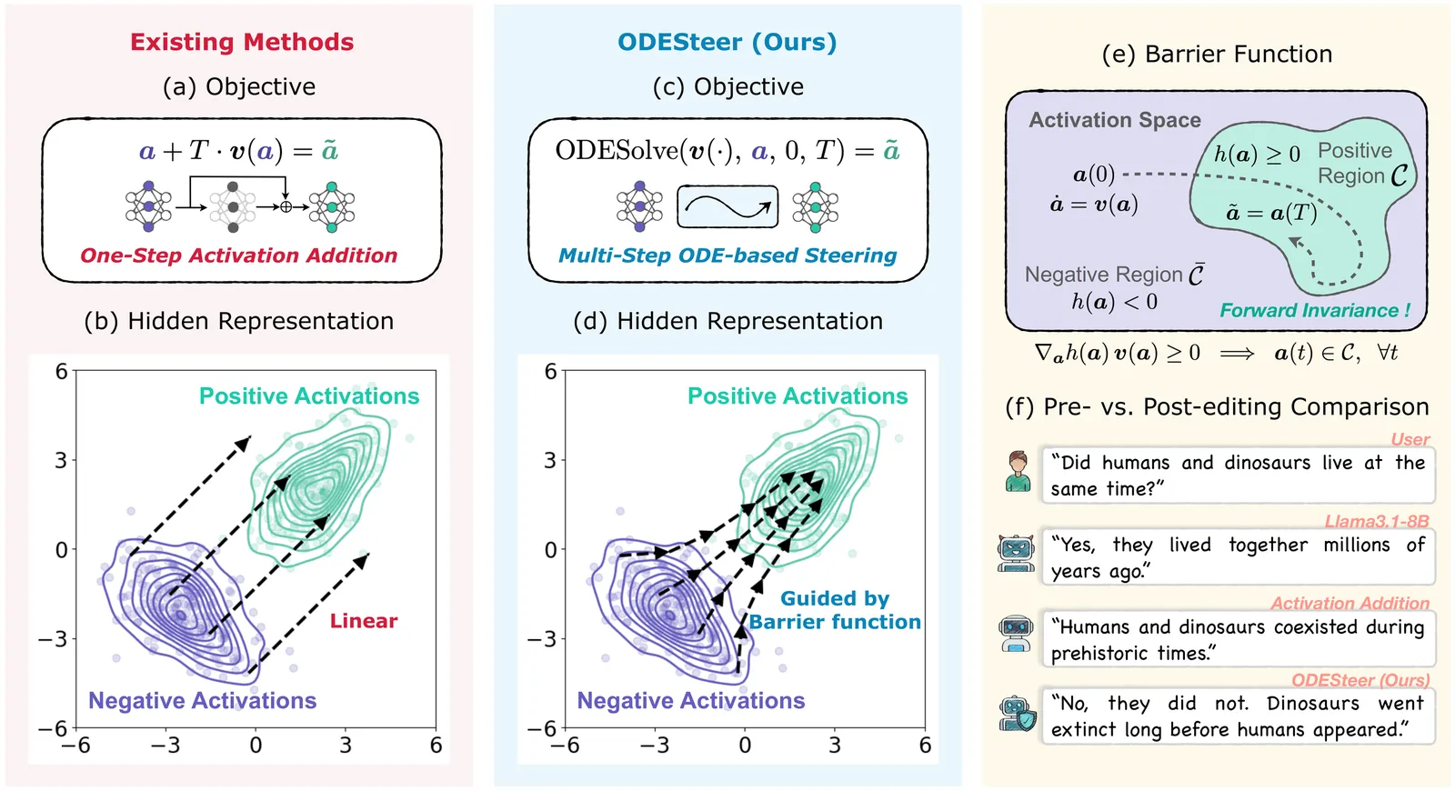 Activation steering, or representation engineering, offers a lightweight approach to align large language models (LLMs) by manipulating their internal activations at inference time. However, current methods suffer from two key limitations: \textit{(i)} the lack of a unified theoretical framework for guiding the design of steering directions, and \textit{(ii)} an over-reliance on \textit{one-step steering} that fail to capture complex patterns of activation distributions. In this work, we propose a unified ordinary differential equations (ODEs)-based \textit{theoretical} framework for activation steering in LLM alignment. We show that conventional activation addition can be interpreted as a first-order approximation to the solution of an ODE. Based on this ODE perspective, identifying a steering direction becomes equivalent to designing a \textit{barrier function} from control theory. Derived from this framework, we introduce ODESteer, a kind of ODE-based steering guided by barrier functions, which shows \textit{empirical} advancement in LLM alignment. ODESteer identifies steering directions by defining the barrier function as the log-density ratio between positive and negative activations, and employs it to construct an ODE for \textit{multi-step and adaptive} steering. Compared to state-of-the-art activation steering methods, ODESteer achieves consistent empirical improvements on diverse LLM alignment benchmarks, a notable $5.7\%$ improvement over TruthfulQA, $2.5\%$ over UltraFeedback, and $2.4\%$ over RealToxicityPrompts. Our work establishes a principled new view of activation steering in LLM alignment by unifying its theoretical foundations via ODEs, and validating it empirically through the proposed ODESteer method.
