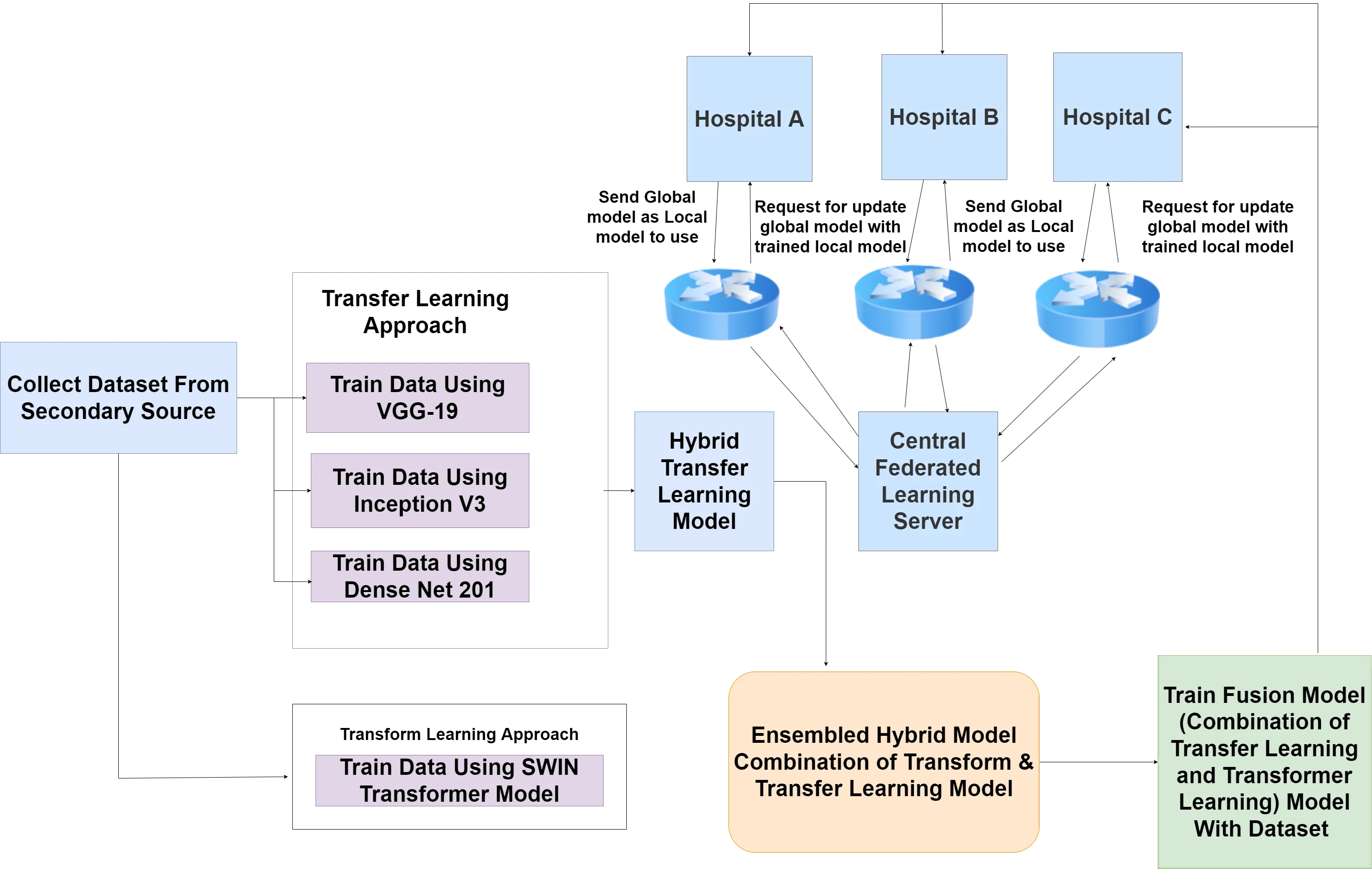 The significant advancements in computational power cre- ate a vast opportunity for using Artificial Intelligence in different ap- plications of healthcare and medical science. A Hybrid FL-Enabled Ensemble Approach For Lung Disease Diagnosis Leveraging a Combination of SWIN Transformer and CNN is the combination of cutting-edge technology of AI and Federated Learning. Since, medi- cal specialists and hospitals will have shared data space, based on that data, with the help of Artificial Intelligence and integration of federated learning, we can introduce a secure and distributed system for medical data processing and create an efficient and reliable system. The proposed hybrid model enables the detection of COVID-19 and Pneumonia based on x-ray reports. We will use advanced and the latest available tech- nology offered by Tensorflow and Keras along with Microsoft-developed Vision Transformer, that can help to fight against the pandemic that the world has to fight together as a united. We focused on using the latest available CNN models (DenseNet201, Inception V3, VGG 19) and the Transformer model SWIN Transformer in order to prepare our hy- brid model that can provide a reliable solution as a helping hand for the physician in the medical field. In this research, we will discuss how the Federated learning-based Hybrid AI model can improve the accuracy of disease diagnosis and severity prediction of a patient using the real-time continual learning approach and how the integration of federated learn- ing can ensure hybrid model security and keep the authenticity of the information.