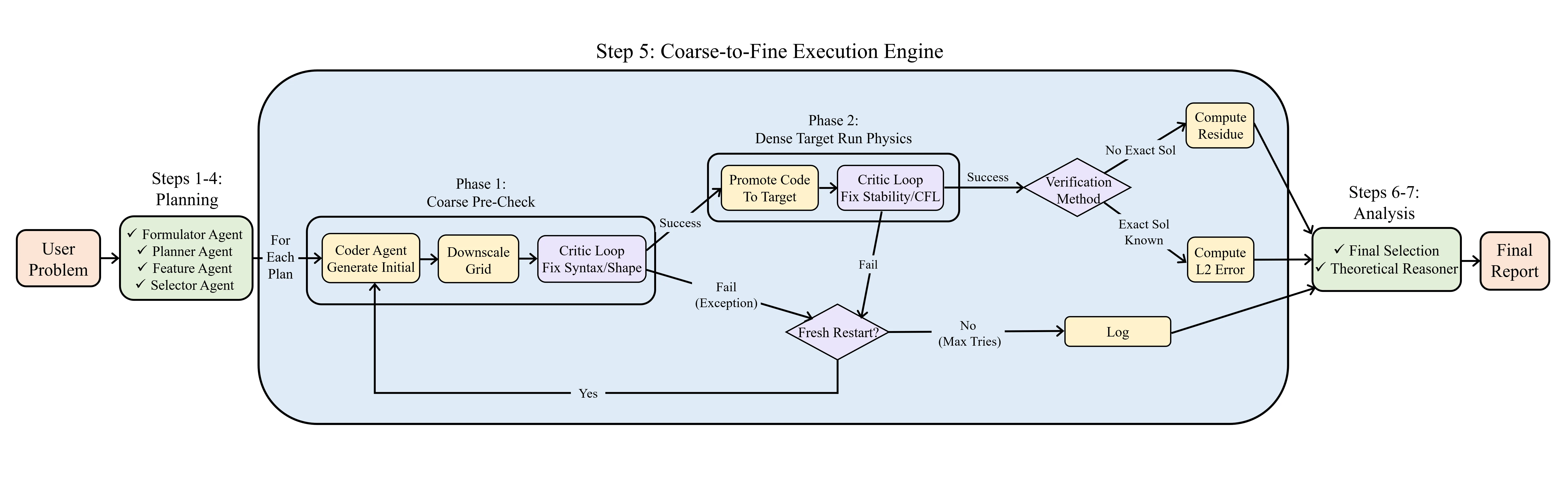 PDEs are central to scientific and engineering modeling, yet designing accurate numerical solvers typically requires substantial mathematical expertise and manual tuning. Recent neural network-based approaches improve flexibility but often demand high computational cost and suffer from limited interpretability. We introduce \texttt{AutoNumerics}, a multi-agent framework that autonomously designs, implements, debugs, and verifies numerical solvers for general PDEs directly from natural language descriptions. Unlike black-box neural solvers, our framework generates transparent solvers grounded in classical numerical analysis. We introduce a coarse-to-fine execution strategy and a residual-based self-verification mechanism. Experiments on 24 canonical and real-world PDE problems demonstrate that \texttt{AutoNumerics} achieves competitive or superior accuracy compared to existing neural and LLM-based baselines, and correctly selects numerical schemes based on PDE structural properties, suggesting its viability as an accessible paradigm for automated PDE solving.