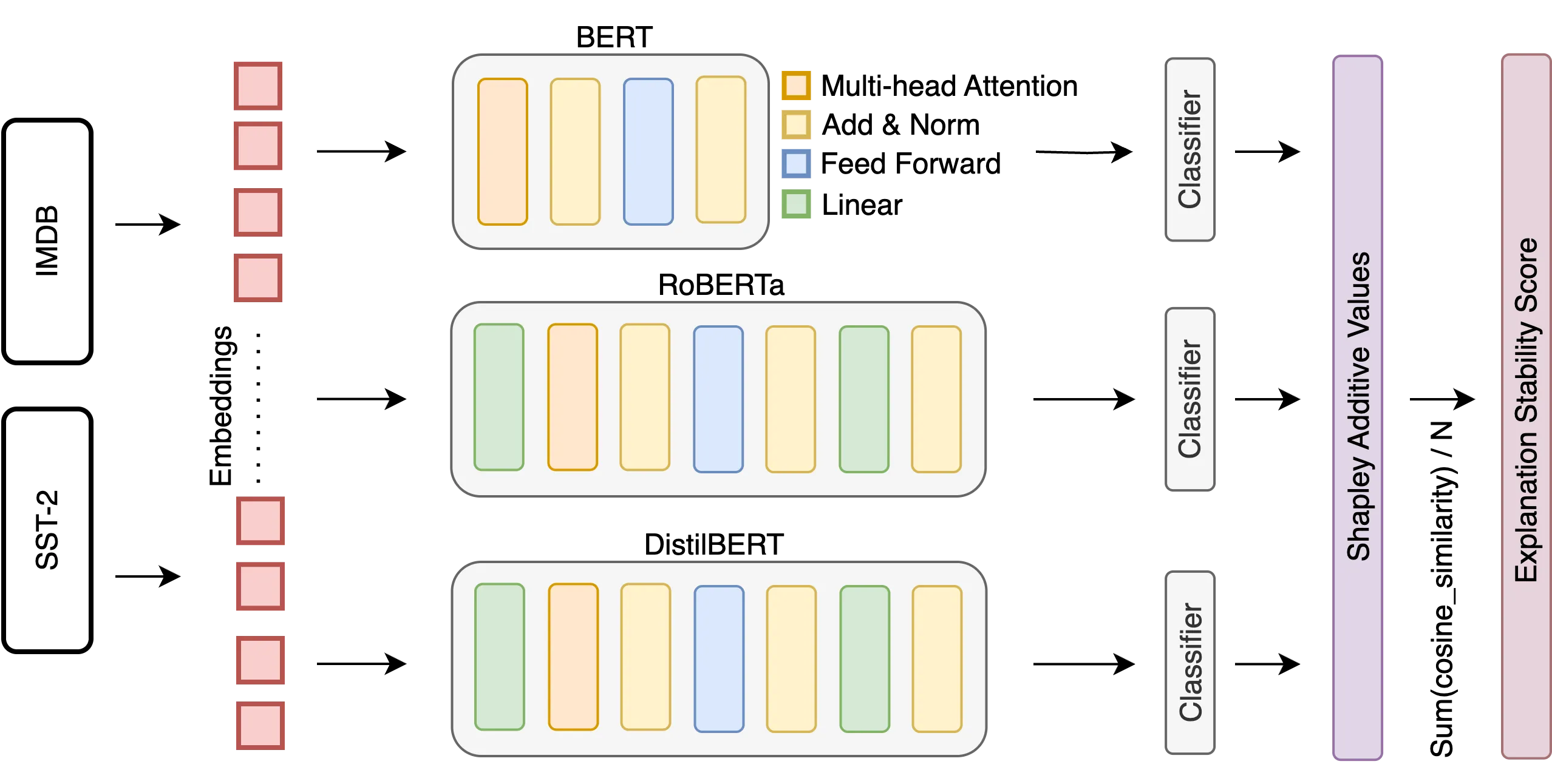 Reliable pattern recognition systems should exhibit consistent behavior across similar inputs, and their explanations should remain stable. However, most Explainable AI evaluations remain instance centric and do not explicitly quantify whether attribution patterns are consistent across samples that share the same class or represent small variations of the same input. In this work, we propose a novel metric aimed at assessing the consistency of model explanations, ensuring that models consistently reflect the intended objectives and consistency under label-preserving perturbations. We implement this metric using a pre-trained BERT model on the SST-2 sentiment analysis dataset, with additional robustness tests on RoBERTa, DistilBERT, and IMDB, applying SHAP to compute feature importance for various test samples. The proposed metric quantifies the cosine similarity of SHAP values for inputs with the same label, aiming to detect inconsistent behaviors, such as biased reliance on certain features or failure to maintain consistent reasoning for similar predictions. Through a series of experiments, we evaluate the ability of this metric to identify misaligned predictions and inconsistencies in model explanations. These experiments are compared against standard fidelity metrics to assess whether the new metric can effectively identify when a model's behavior deviates from its intended objectives. The proposed framework provides a deeper understanding of model behavior by enabling more robust verification of rationale stability, which is critical for building trustworthy AI systems. By quantifying whether models rely on consistent attribution patterns for similar inputs, the proposed approach supports more robust evaluation of model behavior in practical pattern recognition pipelines. Our code is publicly available at https://github.com/anmspro/ESS-XAI-Stability.