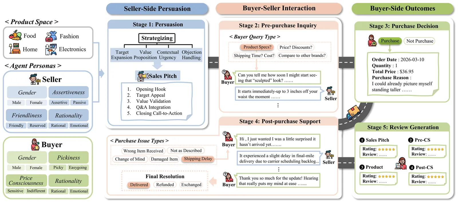 Evaluating retail strategies before deployment is difficult, as outcomes are determined across multiple stages, from seller-side persuasion through buyer-seller interaction to purchase decisions. However, existing retail simulators capture only partial aspects of this process and do not model cross-stage dependencies, making it difficult to assess how early decisions affect downstream outcomes. We present RetailSim, an end-to-end retail simulation framework that models this pipeline in a unified environment, explicitly designed for simulation fidelity through diverse product spaces, persona-driven agents, and multi-turn interactions. We evaluate RetailSim with a dual protocol comprising human evaluation of behavioral fidelity and meta-evaluation against real-world economic regularities, showing that it successfully reproduces key patterns such as demographic purchasing behavior, the price-demand relationship, and heterogeneous price elasticity. We further demonstrate its practical utility via decision-oriented use cases, including persona inference, seller-buyer interaction analysis, and sales strategy evaluation, showing RetailSim's potential as a controlled testbed for exploring retail strategies.
