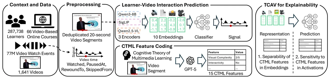 Learners' use of video controls in educational videos provides implicit signals of cognitive processing and instructional design quality, yet the lack of scalable and explainable predictive models limits instructors' ability to anticipate such behavior before deployment. We propose a scalable, interpretable pipeline for predicting population-level watching, pausing, skipping, and rewinding behavior as proxies for cognitive load from video content alone. Our approach leverages multimodal large language models (MLLMs) to compute embeddings of short video segments and trains a neural classifier to identify temporally fine-grained interaction peaks. Drawing from multimedia learning theory on instructional design for optimal cognitive load, we code features of the video segments using GPT-5 and employ them as a basis for interpreting model predictions via concept activation vectors. We evaluate our pipeline on 77 million video control events from 66 online courses. Our findings demonstrate that classifiers based on MLLM embeddings reliably predict interaction peaks, generalize to unseen academic fields, and encode interpretable, theory-relevant instructional concepts. Overall, our results show the feasibility of cost-efficient, interpretable pre-screening of educational video design and open new opportunities to empirically examine multimedia learning theory at scale.
