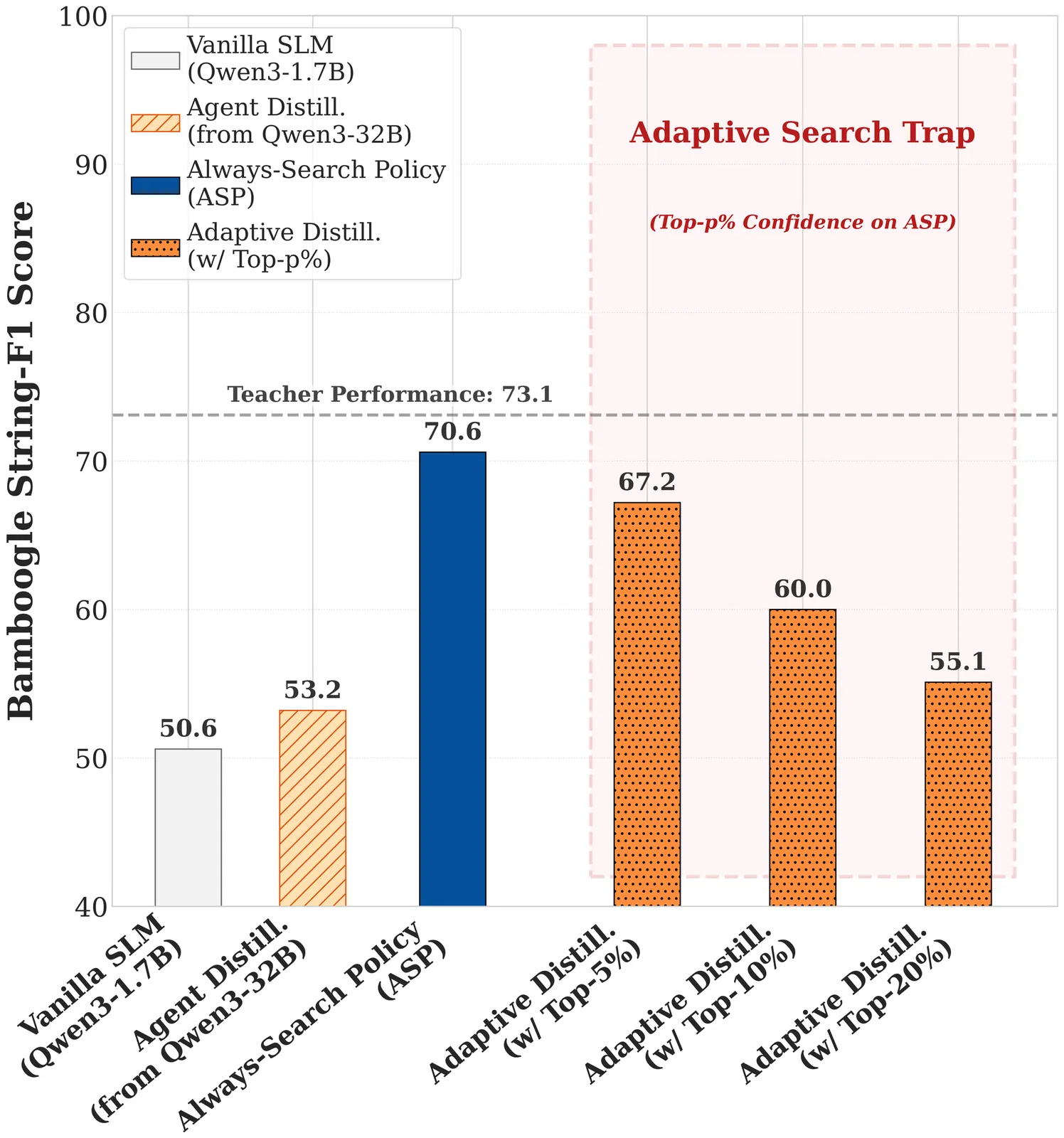 Agents equipped with search tools have emerged as effective solutions for knowledge-intensive tasks. While Large Language Models (LLMs) exhibit strong reasoning capabilities, their high computational cost limits practical deployment for search agents. Consequently, recent work has focused on distilling agentic behaviors from LLMs into Small Language Models (SLMs). Through comprehensive evaluation on complex multi-hop reasoning tasks, we find that despite possessing less parametric knowledge, SLMs invoke search tools less frequently and are more prone to hallucinations. To address this issue, we propose \policy, a lightweight fine-tuning approach that explicitly trains SLMs to reliably retrieve and generate answers grounded in retrieved evidence. Compared to agent distillation from LLMs, our approach improves performance by 17.3 scores on Bamboogle and 15.3 scores on HotpotQA, achieving LLM-level results across benchmarks. Our further analysis reveals that adaptive search strategies in SLMs often degrade performance, highlighting the necessity of consistent search behavior for reliable reasoning.