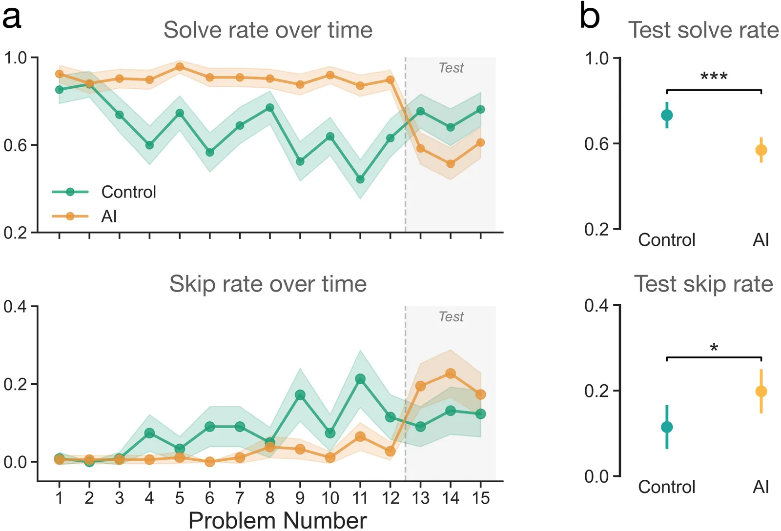 People often optimize for long-term goals in collaboration: A mentor or companion doesn't just answer questions, but also scaffolds learning, tracks progress, and prioritizes the other person's growth over immediate results. In contrast, current AI systems are fundamentally short-sighted collaborators - optimized for providing instant and complete responses, without ever saying no (unless for safety reasons). What are the consequences of this dynamic? Here, through a series of randomized controlled trials on human-AI interactions (N = 1,222), we provide causal evidence for two key consequences of AI assistance: reduced persistence and impairment of unassisted performance. Across a variety of tasks, including mathematical reasoning and reading comprehension, we find that although AI assistance improves performance in the short-term, people perform significantly worse without AI and are more likely to give up. Notably, these effects emerge after only brief interactions with AI (approximately 10 minutes). These findings are particularly concerning because persistence is foundational to skill acquisition and is one of the strongest predictors of long-term learning. We posit that persistence is reduced because AI conditions people to expect immediate answers, thereby denying them the experience of working through challenges on their own. These results suggest the need for AI model development to prioritize scaffolding long-term competence alongside immediate task completion.