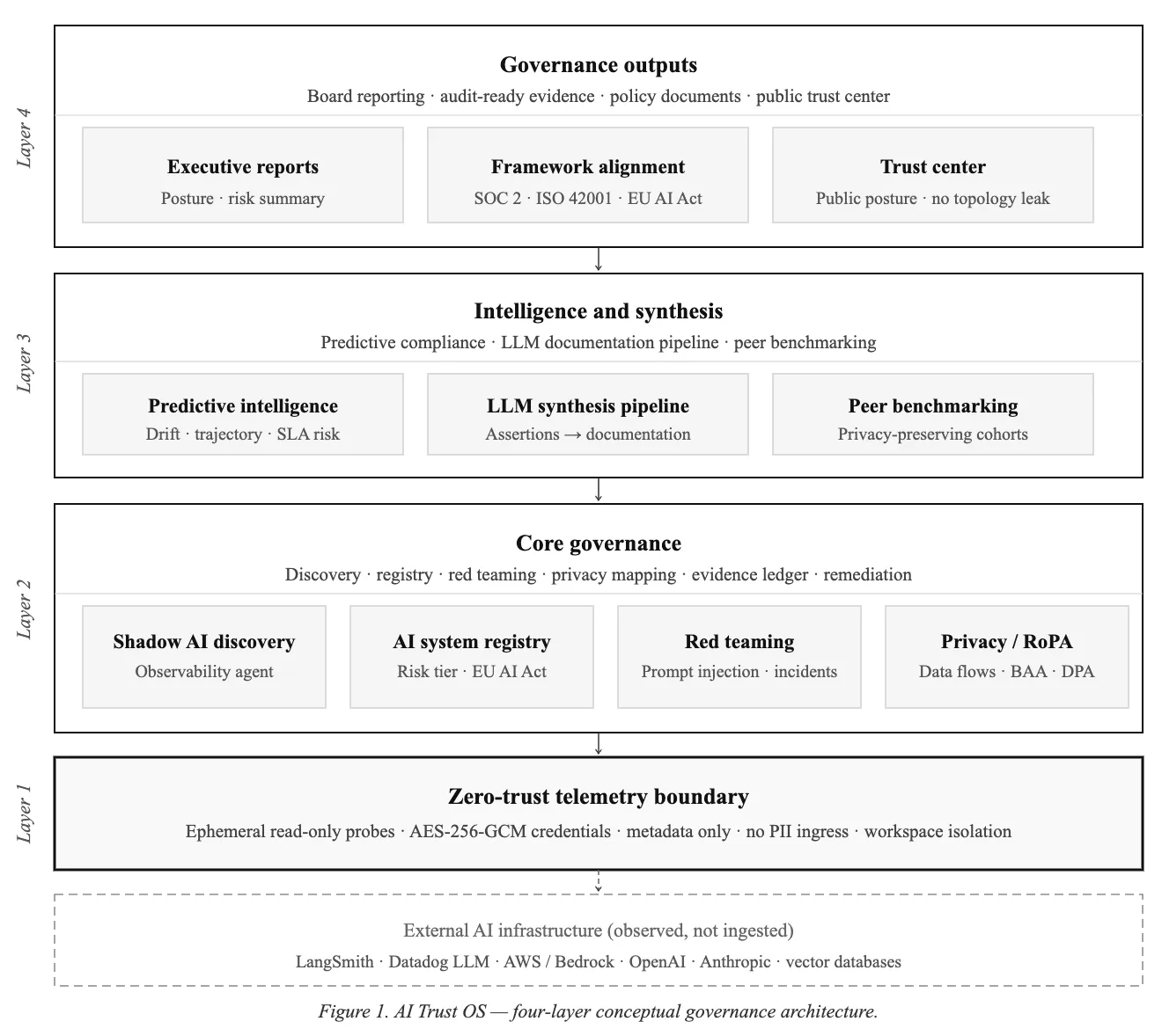 The accelerating adoption of large language models, retrieval-augmented generation pipelines, and multi-agent AI workflows has created a structural governance crisis. Organizations cannot govern what they cannot see, and existing compliance methodologies built for deterministic web applications provide no mechanism for discovering or continuously validating AI systems that emerge across engineering teams without formal oversight. The result is a widening trust gap between what regulators demand as proof of AI governance maturity and what organizations can demonstrate. This paper proposes AI Trust OS, a governance architecture for continuous, autonomous AI observability and zero-trust compliance. AI Trust OS reconceptualizes compliance as an always-on, telemetry-driven operating layer in which AI systems are discovered through observability signals, control assertions are collected by automated probes, and trust artifacts are synthesized continuously. The framework rests on four principles: proactive discovery, telemetry evidence over manual attestation, continuous posture over point-in-time audit, and architecture-backed proof over policy-document trust. The framework operates through a zero-trust telemetry boundary in which ephemeral read-only probes validate structural metadata without ingressing source code or payload-level PII. An AI Observability Extractor Agent scans LangSmith and Datadog LLM telemetry, automatically registering undocumented AI systems and shifting governance from organizational self-report to empirical machine observation. Evaluated across ISO 42001, the EU AI Act, SOC 2, GDPR, and HIPAA, the paper argues that telemetry-first AI governance represents a categorical architectural shift in how enterprise trust is produced and demonstrated.