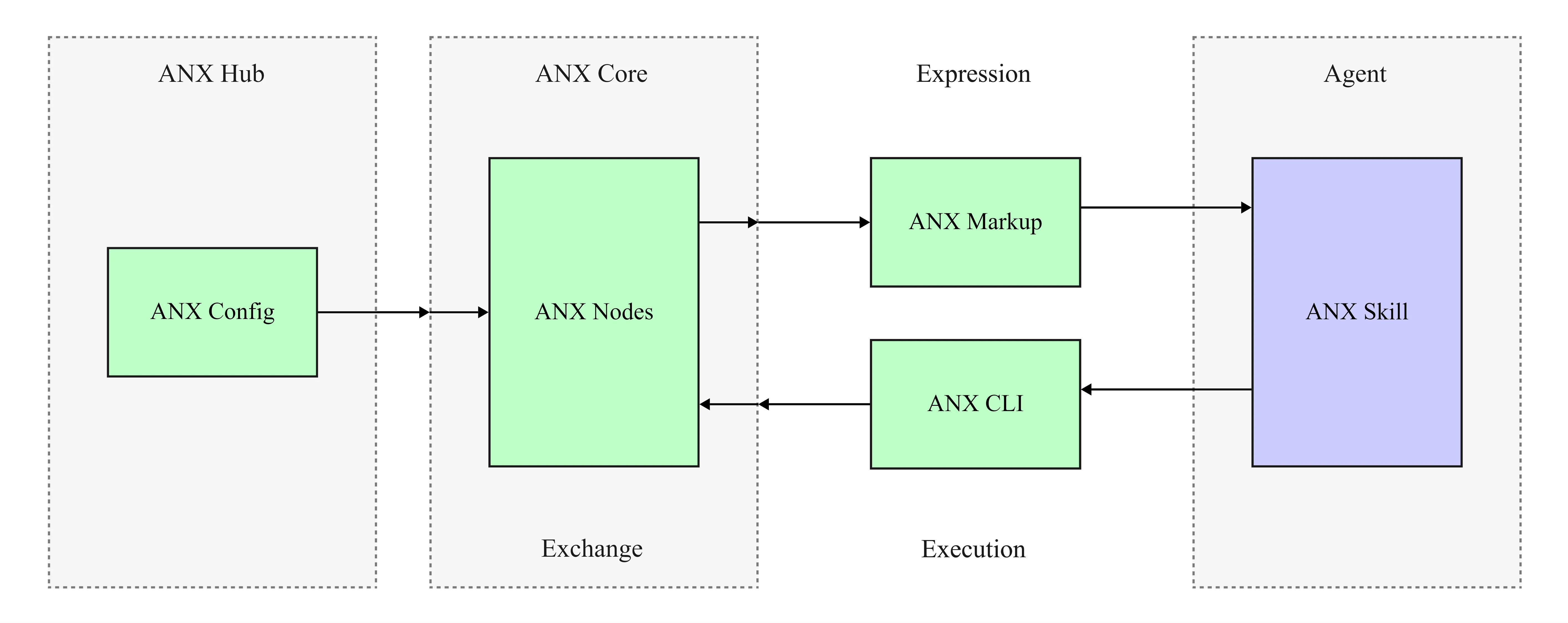 AI agents, autonomous digital actors, need agent-native protocols; existing methods include GUI automation and MCP-based skills, with defects of high token consumption, fragmented interaction, inadequate security, due to lacking a unified top-level framework and key components, each independent module flawed. To address these issues, we present ANX, an open, extensible, verifiable agent-native protocol and top-level framework integrating CLI, Skill, MCP, resolving pain points via protocol innovation, architectural optimization and tool supplementation. Its four core innovations: 1) Agent-native design (ANX Config, Markup, CLI) with high information density, flexibility and strong adaptability to reduce tokens and eliminate inconsistencies; 2) Human-agent interaction combining Skill's flexibility for dual rendering as agent-executable instructions and human-readable UI; 3) MCP-supported on-demand lightweight apps without pre-registration; 4) ANX Markup-enabled machine-executable SOPs eliminating ambiguity for reliable long-horizon tasks and multi-agent collaboration. As the first in a series, we focus on ANX's design, present its 3EX decoupled architecture with ANXHub and preliminary feasibility analysis and experimental validation. ANX ensures native security: LLM-bypassed UI-to-Core communication keeps sensitive data out of agent context; human-only confirmation prevents automated misuse. Form-filling experiments with Qwen3.5-plus/GPT-4o show ANX reduces tokens by 47.3% (Qwen3.5-plus) and 55.6% (GPT-4o) vs MCP-based skills, 57.1% (Qwen3.5-plus) and 66.3% (GPT-4o) vs GUI automation, and shortens execution time by 58.1% and 57.7% vs MCP-based skills.