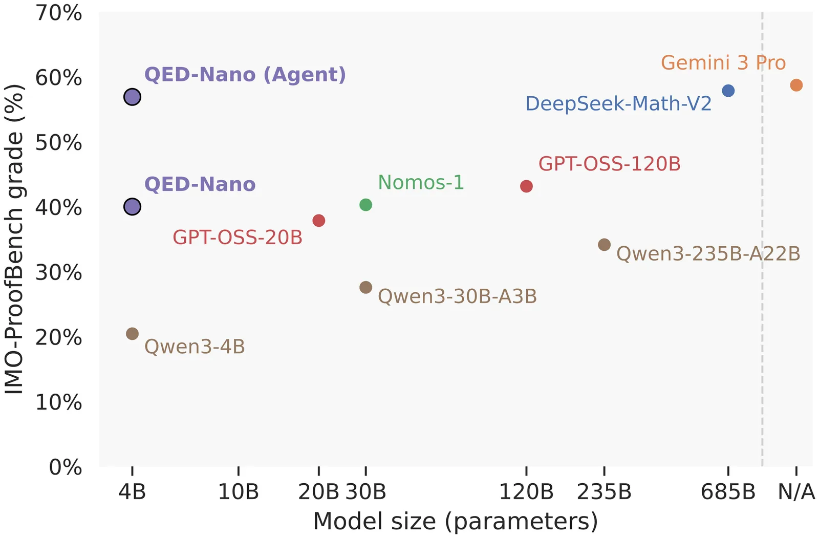Proprietary AI systems have recently demonstrated impressive capabilities on complex proof-based problems, with gold-level performance reported at the 2025 International Mathematical Olympiad (IMO). However, the training pipelines behind these systems remain largely undisclosed, and their reliance on large "internal" models and scaffolds makes them expensive to run, difficult to reproduce, and hard to study or improve upon. This raises a central question: can small, open models also be trained to achieve competitive reasoning performance on difficult Olympiad-level math? In this paper, we answer this question by building QED-Nano, a 4B model post-trained for Olympiad-level proofs. Our training recipe has three stages: (1) supervised fine-tuning to imbue good proof-writing styles by distilling from DeepSeek-Math-V2, (2) reinforcement learning (RL) with rubric-based rewards, and (3) expanding RL with a reasoning cache, which decomposes long proofs into iterative summarize-and-refine cycles and enables stronger test-time reasoning. QED-Nano surpasses the proof-generation performance of much larger open models, including Nomos-1 and GPT-OSS-120B, and approaches the performance of proprietary models like Gemini 3 Pro, at a fraction of the inference cost. To support further research on open mathematical reasoning, we release the full QED-Nano pipeline, including the QED-Nano and QED-Nano-SFT models, the FineProofs-SFT and FineProofs-RL datasets, and the training and evaluation code.