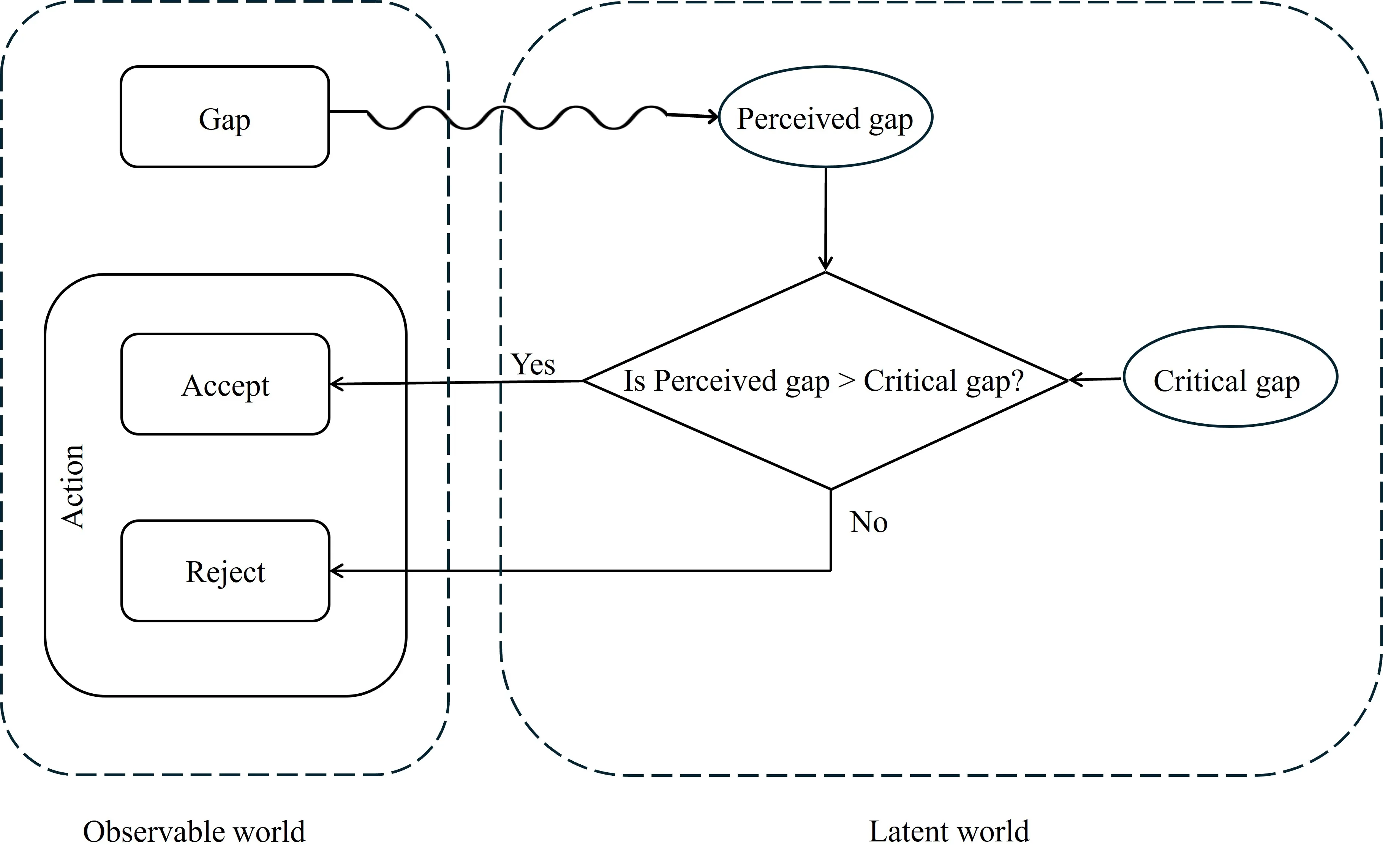 This work on gap acceptance is based on the premise that the decision to accept/reject a gap happens in a person's mind and therefore must be based on the perceived gap and not the measured gap. The critical gap must also exist in a person's mind and hence, together with the perceived gap, is a latent variable. Finally, it is also proposed that the critical gap is influenced by various exogenous variables such as subject and opposing vehicle types, and perceived waiting time. Mathematical models that (i) incorporate systematic and random distortions during the perception process and (ii) account for the effect of the various influencing variables are developed. The parameters of these models are estimated for two different gap acceptance data sets using the maximum likelihood technique. The data is collected as part of this study. The estimated parameters throw valuable insights into how these influencing variables affect the critical gap. The results corroborate the initial predictions on the nature of influence these variables must exert and give strength to the gap acceptance decision-making construct proposed here. This work also proposes a methodology to estimate a measurable/observable world emulator of the latent variable critical gap. The use of the emulator critical gap provides improved estimates of derived quantities like the average waiting time of subject vehicles. Finally, studies are also conducted to show that the number of rejected gaps can work as a reasonable surrogate for the influencing variable, waiting time.