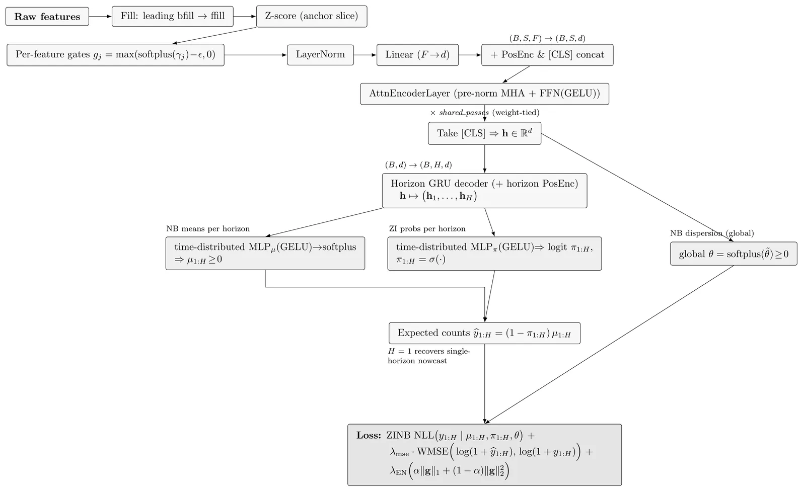 Forecasting conflict-related fatalities remains a central challenge in political science and policy analysis due to the sparse, bursty, and highly non-stationary nature of violence data. We introduce DynAttn, an interpretable dynamic-attention forecasting framework for high-dimensional spatio-temporal count processes. DynAttn combines rolling-window estimation, shared elastic-net feature gating, a compact weight-tied self-attention encoder, and a zero-inflated negative binomial (ZINB) likelihood. This architecture produces calibrated multi-horizon forecasts of expected casualties and exceedance probabilities, while retaining transparent diagnostics through feature gates, ablation analysis, and elasticity measures. We evaluate DynAttn using global country-level and high-resolution PRIO-grid-level conflict data from the VIEWS forecasting system, benchmarking it against established statistical and machine-learning approaches, including DynENet, LSTM, Prophet, PatchTST, and the official VIEWS baseline. Across forecast horizons from one to twelve months, DynAttn consistently achieves substantially higher predictive accuracy, with particularly large gains in sparse grid-level settings where competing models often become unstable or degrade sharply. Beyond predictive performance, DynAttn enables structured interpretation of regional conflict dynamics. In our application, cross-regional analyses show that short-run conflict persistence and spatial diffusion form the core predictive backbone, while climate stress acts either as a conditional amplifier or a primary driver depending on the conflict theater.