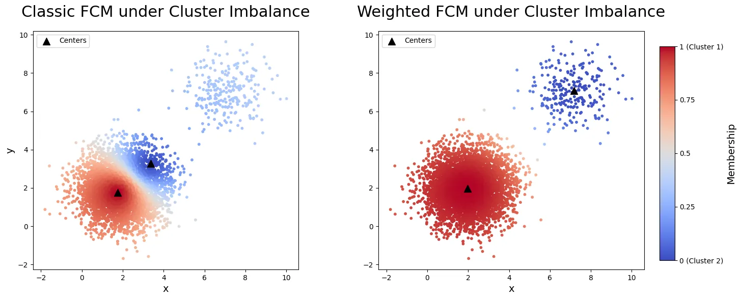 Clustering is a central tool in biomedical research for discovering heterogeneous patient subpopulations, where group boundaries are often diffuse rather than sharply separated. Traditional methods produce hard partitions, whereas soft clustering methods such as fuzzy $c$-means (FCM) allow mixed memberships and better capture uncertainty and gradual transitions. Despite the widespread use of FCM, principled statistical inference for fuzzy clustering remains limited. We develop a new framework for weighted fuzzy $c$-means (WFCM) for settings with potential cluster size imbalance. Cluster-specific weights rebalance the classical FCM criterion so that smaller clusters are not overwhelmed by dominant groups, and the weighted objective induces a normalized density model with scale parameter $σ$ and fuzziness parameter $m$. Estimation is performed via a blockwise majorize--minimize (MM) procedure that alternates closed-form membership and centroid updates with likelihood-based updates of $(σ,\bw)$. The intractable normalizing constant is approximated by importance sampling using a data-adaptive Gaussian mixture proposal. We further provide likelihood ratio tests for comparing cluster centers and bootstrap-based confidence intervals. We establish consistency and asymptotic normality of the maximum likelihood estimator, validate the method through simulations, and illustrate it using single-cell RNA-seq and Alzheimer disease Neuroimaging Initiative (ADNI) data. These applications demonstrate stable uncertainty quantification and biologically meaningful soft memberships, ranging from well-separated cell populations under imbalance to a graded AD versus non-AD continuum consistent with disease progression.