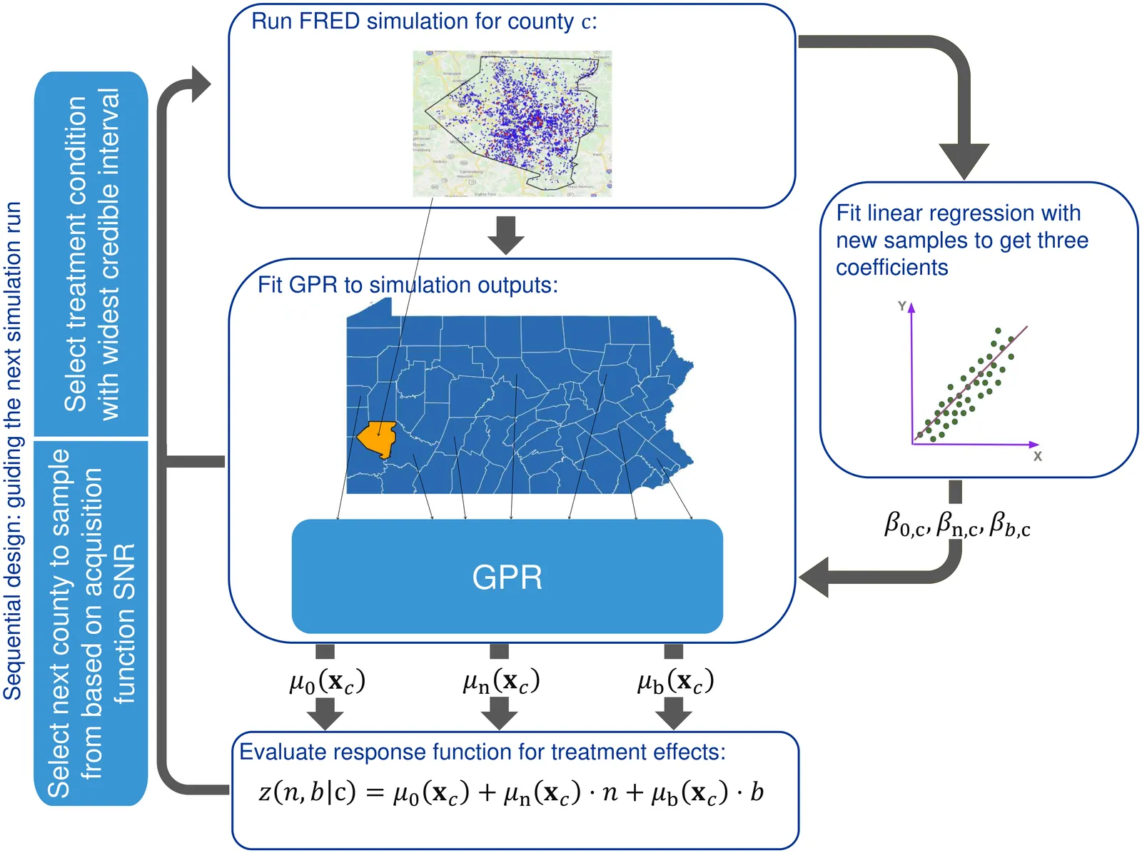 Population-scale agent-based simulations of the opioid epidemic help evaluate intervention strategies and overdose outcomes in heterogeneous communities and provide estimates of localized treatment effects, which support the design of locally-tailored policies for precision public health. However, it is prohibitively costly to run simulations of all treatment conditions in all communities because the number of possible treatments grows exponentially with the number of interventions and levels at which they are applied. To address this need efficiently, we develop a metamodel framework, whereby treatment outcomes are modeled using a response function whose coefficients are learned through Gaussian process regression (GPR) on locally-contextualized covariates. We apply this framework to efficiently estimate treatment effects on overdose deaths in Pennsylvania counties. In contrast to classical designs such as fractional factorial design or Latin hypercube sampling, our approach leverages spatial correlations and posterior uncertainty to sequentially sample the most informative counties and treatment conditions. Using a calibrated agent-based opioid epidemic model, informed by county-level overdose mortality and baseline dispensing rate data for different treatments, we obtained county-level estimates of treatment effects on overdose deaths per 100,000 population for all treatment conditions in Pennsylvania, achieving approximately 5% average relative error using one-tenth the number of simulation runs required for exhaustive evaluation. Our bi-level framework provides a computationally efficient approach to decision support for policy makers, enabling rapid evaluation of alternative resource-allocation strategies to mitigate the opioid epidemic in local communities. The same analytical framework can be applied to guide precision public health interventions in other epidemic settings.