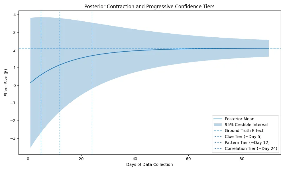 Personal health analytics systems face a persistent cold-start dilemma: users expect meaningful insights early in data collection, while conventional statistical inference requires data volumes that often exceed engagement horizons. Existing approaches either delay inference until fixed statistical thresholds are met -- leading to user disengagement -- or surface heuristic insights without formal uncertainty quantification, risking false confidence. We propose a progressive Bayesian confidence architecture that formalizes early-stage inference through phased interpretation of posterior uncertainty. Drawing on Bayesian updating and epistemic strategies from financial risk modeling under sparse observations, we map posterior contraction to interpretable tiers of insight, ranging from exploratory directional evidence to robust associative inference. We demonstrate the framework's performance through controlled experimentation with synthetic N-of-1 health data, showing that calibrated early insights can be generated within 5--7 days while maintaining explicit epistemic humility. Compared to fixed-threshold baselines requiring 30+ days of data, the proposed approach yields earlier directional signals (mean: 5.3 vs 31.7 days, p<0.001) while controlling false discovery rates below 6% (5.9% at day 30) despite 26-day earlier detection, compared to 0% FDR for fixed-threshold baselines that delay insights by 30 days. In addition, we show strong uncertainty calibration (76% credible interval coverage for ground-truth correlations at day 90). This work contributes a methodological framework for uncertainty-aware early inference in personalized health analytics that bridges the gap between user engagement requirements and statistical rigor.