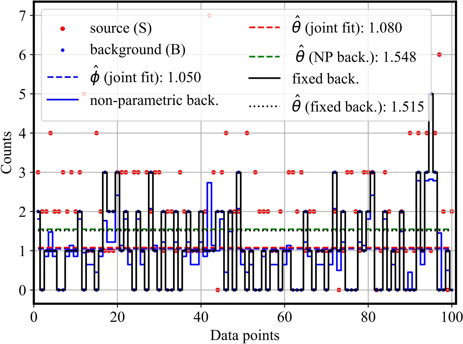This paper provides a statistical analysis of three common methods of regression for Poisson data in the presence of Poisson background, namely the joint fit with two parametric models for the source and the background, the use of a non-parametric model for the background known as the wstat method, and the regression with a fixed background. The non-parametric background method, which is a popular method for spectral data, is found to be significantly biased, especially in the low-count and background-dominated regimes. Similar conclusions apply to the fixed-background regression. The joint-fit method, on the other hand, simultaneously affords reliable hypothesis testing by means of the usual Cash statistic and unbiased reconstruction of source parameters. We also investigate the effect of non-parametric regression on the number of effective degrees of freedom by means of the Efron degree of freedom function. We find that the wstat method adds a significantly larger number of degrees of freedom, compared to the number of free parameters in the source model. The other two methods have a number of degrees of freedom consistent with the number of adjustable parameters, at least for the simple models investigated in this paper.