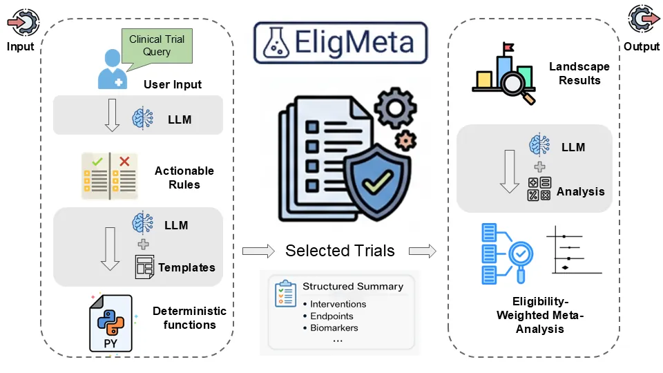 Clinical evidence synthesis requires identifying relevant trials from large registries and aggregating results that account for population differences. While recent LLM-based approaches have automated components of systematic review, they do not support end-to-end evidence synthesis. Moreover, conventional meta-analysis weights studies by statistical precision without considering clinical compatibility reflected in eligibility criteria. We propose EligMeta, an agentic framework that integrates automated trial discovery with eligibility-aware meta-analysis, translating natural-language queries into reproducible trial selection and incorporating eligibility alignment into study weighting to produce cohort-specific pooled estimates. EligMeta employs a hybrid architecture separating LLM-based reasoning from deterministic execution: LLMs generate interpretable rules from natural-language queries and perform schema-constrained parsing of trial metadata, while all logical operations, weight computations, and statistical pooling are executed deterministically to ensure reproducibility. The framework structures eligibility criteria and computes similarity-based study weights reflecting population alignment between target and comparator trials. In a gastric cancer landscape analysis, EligMeta reduced 4,044 candidate trials to 39 clinically relevant studies through rule-based filtering, recovering all 13 guideline-cited trials. In an olaparib adverse events meta-analysis across four trials, eligibility-aware weighting shifted the pooled risk ratio from 2.18 (95% CI: 1.71-2.79) under conventional Mantel-Haenszel estimation to 1.97 (95% CI: 1.76-2.20), demonstrating quantifiable impact of incorporating eligibility alignment. EligMeta bridges automated trial discovery with eligibility-aware meta-analysis, providing a scalable and reproducible framework for evidence synthesis in precision medicine.