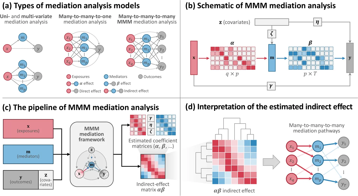 We study high-dimensional mediation analysis in which exposures, mediators, and outcomes are all multivariate, and both exposures and mediators may be high-dimensional. We formalize this as a many (exposures)-to-many (mediators)-to-many (outcomes) (MMM) mediation analysis problem. Methodologically, MMM mediation analysis simultaneously performs variable selection for high-dimensional exposures and mediators, estimates the indirect effect matrix (i.e., the coefficient matrices linking exposure-to-mediator and mediator-to-outcome pathways), and enables prediction of multivariate outcomes. Theoretically, we show that the estimated indirect effect matrices are consistent and element-wise asymptotically normal, and we derive error bounds for the estimators. To evaluate the efficacy of the MMM mediation framework, we first investigate its finite-sample performance, including convergence properties, the behavior of the asymptotic approximations, and robustness to noise, via simulation studies. We then apply MMM mediation analysis to data from the Alzheimer's Disease Neuroimaging Initiative to study how cortical thickness of 202 brain regions may mediate the effects of 688 genome-wide significant single nucleotide polymorphisms (SNPs) (selected from approximately 1.5 million SNPs) on eleven cognitive-behavioral and diagnostic outcomes. The MMM mediation framework identifies biologically interpretable, many-to-many-to-many genetic-neural-cognitive pathways and improves downstream out-of-sample classification and prediction performance. Taken together, our results demonstrate the potential of MMM mediation analysis and highlight the value of statistical methodology for investigating complex, high-dimensional multi-layer pathways in science. The MMM package is available at https://github.com/THELabTop/MMM-Mediation.