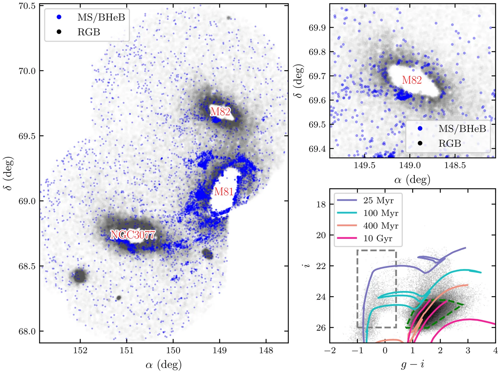 Galaxies evolve in tandem with their environments -- mergers and gas inflows drive galaxy growth while galactic outflows launched by supernovae may seed the galactic environment with gas, metals, and energy, fueling star-formation far from the main bodies of galaxies. The formation histories of young stars in the stellar halos of nearby galaxies can help understand this interplay. We thus present the most detailed map to date of young stars in the stellar halo of M82, a starburst galaxy in the M81 Group that hosts a prototypical outflow, using Hubble Space Telescope (HST) and Subaru Hyper-Suprime Cam observations. We find widespread extraplanar populations of stars with ages $\lesssim630$ Myr, with clear detections of stars up to $\sim5$ kpc to the south in unique arc-like stellar features (Southern Arcs) and in a new stellar trail up to $\sim20$ kpc to the east (M82's Tail), originating from the Southern Arcs. We estimate a total halo star formation of $\sim4\times10^6\,M_\odot$ in the last $630$ Myr. Overall, the star formation history (SFH) of the M82 Tail is correlated with periods of heightened star cluster formation in the M82 disk, which suggests the influence of the starburst outflow. Further, the fraction of young stars decreases as we move away from M82 to the east. We forward a picture where the M82 Tail formed from ram pressure stripped gas arising from M82's westward motion, triggered by shocks from the outflow.