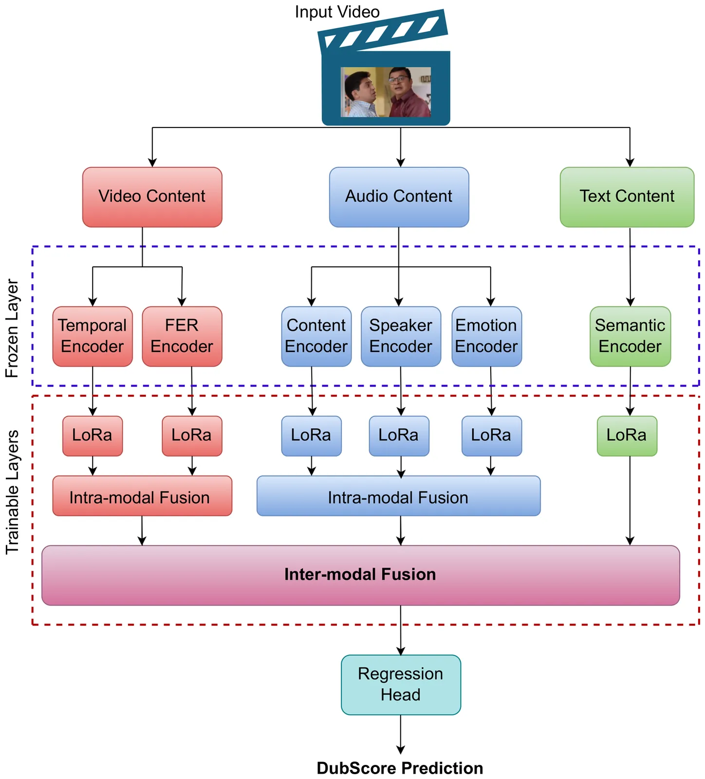 Evaluating AI generated dubbed content is inherently multi-dimensional, shaped by synchronization, intelligibility, speaker consistency, emotional alignment, and semantic context. Human Mean Opinion Scores (MOS) remain the gold standard but are costly and impractical at scale. We present a hierarchical multimodal architecture for perceptually meaningful dubbing evaluation, integrating complementary cues from audio, video, and text. The model captures fine-grained features such as speaker identity, prosody, and content from audio, facial expressions and scene-level cues from video and semantic context from text, which are progressively fused through intra and inter-modal layers. Lightweight LoRA adapters enable parameter-efficient fine-tuning across modalities. To overcome limited subjective labels, we derive proxy MOS by aggregating objective metrics with weights optimized via active learning. The proposed architecture was trained on 12k Hindi-English bidirectional dubbed clips, followed by fine-tuning with human MOS. Our approach achieves strong perceptual alignment (PCC > 0.75), providing a scalable solution for automatic evaluation of AI-dubbed content.