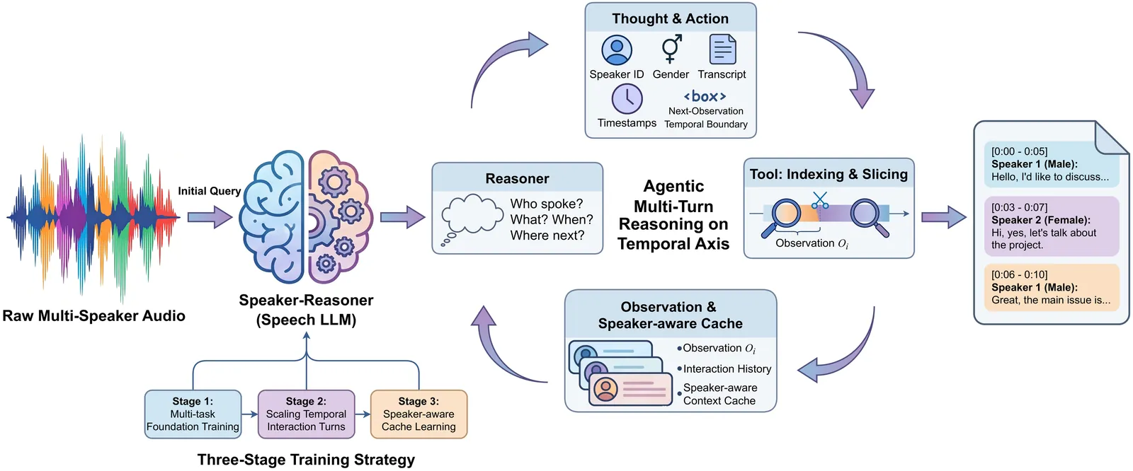 Transcribing and understanding multi-speaker conversations requires speech recognition, speaker attribution, and timestamp localization. While speech LLMs excel at single-speaker tasks, multi-speaker scenarios remain challenging due to overlapping speech, backchannels, rapid turn-taking, and context window constraints. We propose Speaker-Reasoner, an end-to-end Speech LLM with agentic multi-turn temporal reasoning. Instead of single-pass inference, the model iteratively analyzes global audio structure, autonomously predicts temporal boundaries, and performs fine-grained segment analysis, jointly modeling speaker identity, gender, timestamps, and transcription. A speaker-aware cache further extends processing to audio exceeding the training context window. Trained with a three-stage progressive strategy, Speaker-Reasoner achieves consistent improvements over strong baselines on AliMeeting and AISHELL-4 datasets, particularly in handling overlapping speech and complex turn-taking.
