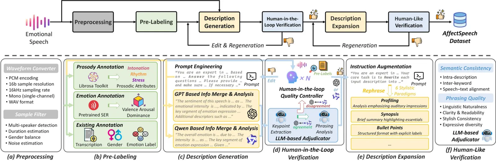 Emotion is essential in spoken communication, yet most existing frameworks in speech emotion modeling rely on predefined categories or low-dimensional continuous attributes, which offer limited expressive capacity. Recent advances in speech emotion captioning and synthesis have shown that textual descriptions provide a more flexible and interpretable alternative for representing affective characteristics in speech. However, progress in this direction is hindered by the lack of an emotional speech dataset aligned with reliable and fine-grained natural language annotations. To tackle this, we introduce AffectSpeech, a large-scale corpus of human-recorded speech enriched with structured descriptions for fine-grained emotion analysis and generation. Each utterance is characterized across six complementary dimensions, including sentiment polarity, open-vocabulary emotion captions, intensity level, prosodic attributes, prominent segments, and semantic content, enabling multi-granular modeling of vocal expression. To balance annotation quality and scalability, we adopt a human-LLM collaborative annotation pipeline that integrates algorithmic pre-labeling, multi-LLM description generation, and human-in-the-loop verification. Furthermore, these annotations are reformulated into diverse descriptive styles to enhance linguistic diversity and reduce stylistic bias in downstream modeling. Experimental results on speech emotion captioning and synthesis demonstrate that models trained on AffectSpeech consistently achieve superior performance across multiple evaluation settings.