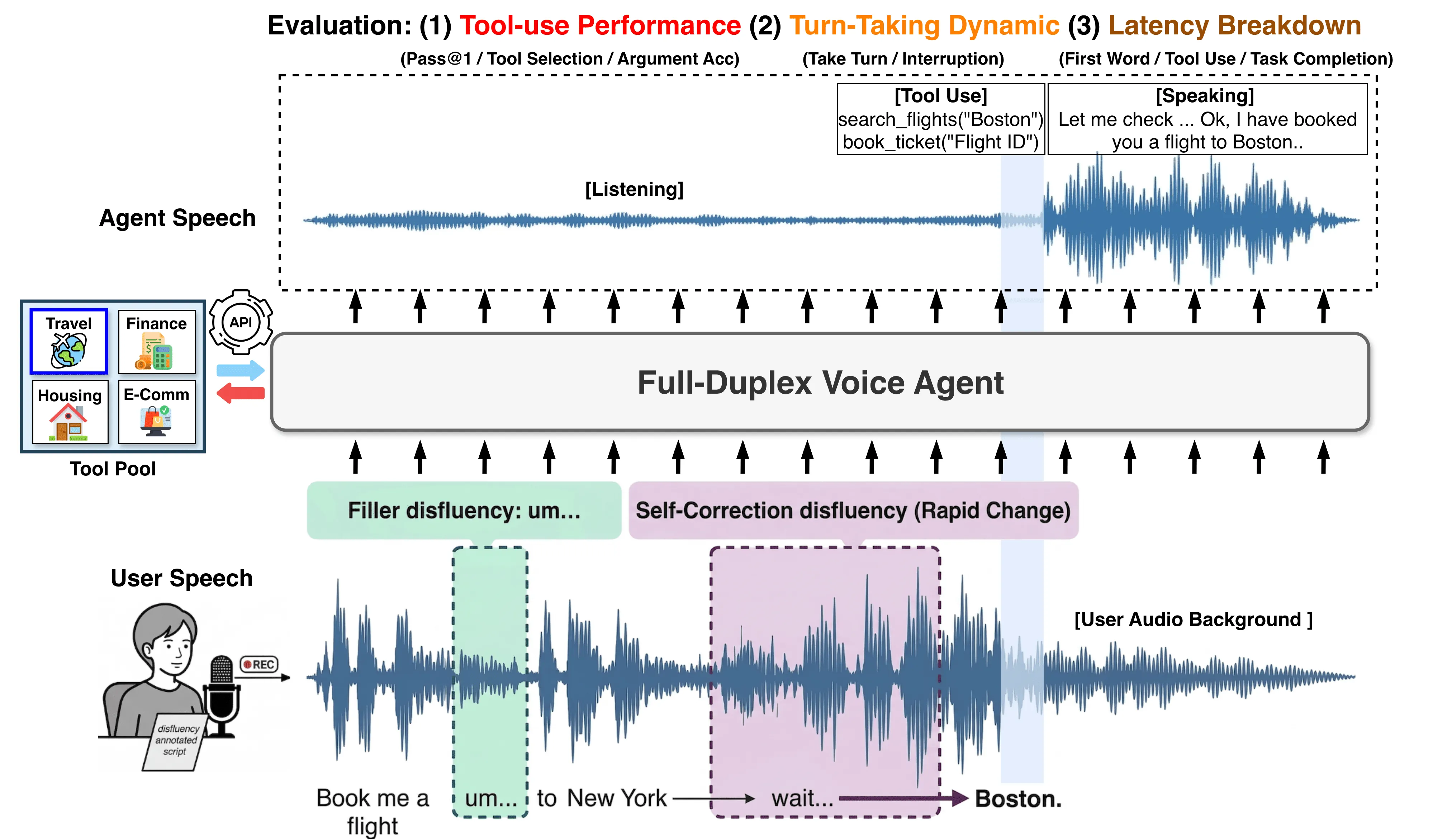 We introduce Full-Duplex-Bench-v3 (FDB-v3), a benchmark for evaluating spoken language models under naturalistic speech conditions and multi-step tool use. Unlike prior work, our dataset consists entirely of real human audio annotated for five disfluency categories, paired with scenarios requiring chained API calls across four task domains. We evaluate six model configurations -- GPT-Realtime, Gemini Live 2.5, Gemini Live 3.1, Grok, Ultravox v0.7, and a traditional Cascaded pipeline (Whisper$\rightarrow$GPT-4o$\rightarrow$TTS) -- across accuracy, latency, and turn-taking dimensions. GPT-Realtime leads on Pass@1 (0.600) and interruption avoidance (13.5\%); Gemini Live 3.1 achieves the fastest latency (4.25~s) but the lowest turn-take rate (78.0\%); and the Cascaded baseline, despite a perfect turn-take rate, incurs the highest latency (10.12~s). Across all systems, self-correction handling and multi-step reasoning under hard scenarios remain the most consistent failure modes.