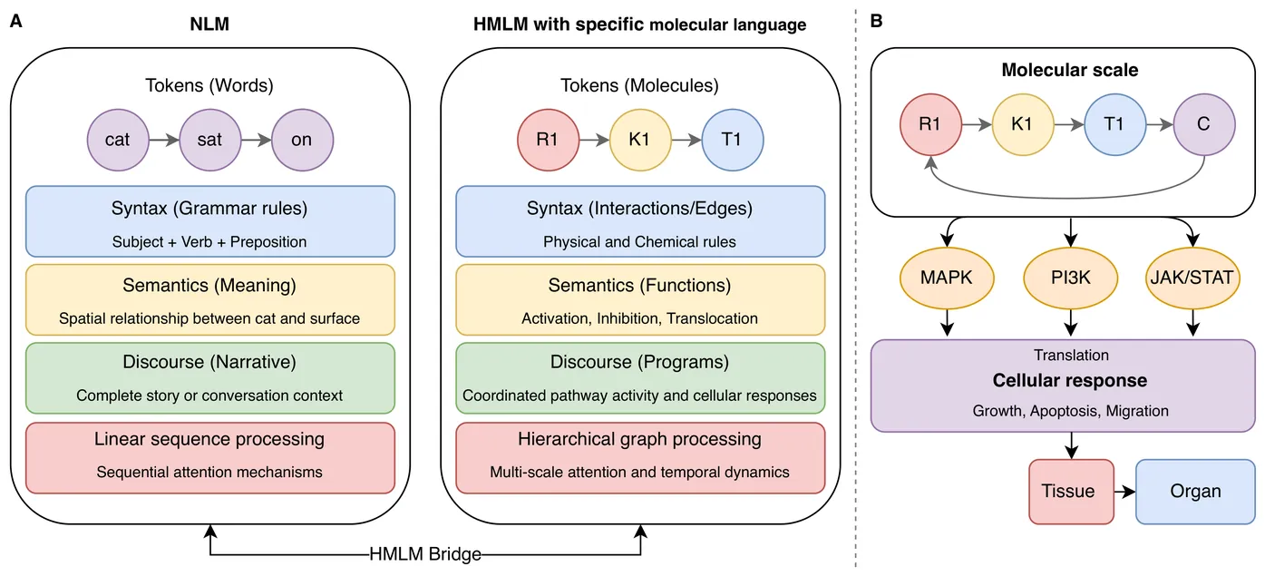 Artificial intelligence (AI) is reshaping computational and network biology by enabling new approaches to decode cellular communication networks. We introduce Hierarchical Molecular Language Models (HMLMs), a novel framework that models cellular signaling as a specialized molecular language, where signaling molecules function as tokens, protein interactions define syntax, and functional consequences constitute semantics. HMLMs employ a transformer-based architecture adapted to accommodate graph-structured signaling networks through information transducers, mathematical entities that capture how molecules receive, process, and transmit signals. The architecture integrates multi-modal data sources across molecular, pathway, and cellular scales through hierarchical attention mechanisms and scale-bridging operators that enable information flow across biological hierarchies. Applied to a complex network of cardiac fibroblast signaling, HMLMs outperformed traditional approaches in temporal dynamics prediction, particularly under sparse sampling conditions. Attention-based analysis revealed biologically meaningful crosstalk patterns, including previously uncharacterized interactions between signaling pathways. By bridging molecular mechanisms with cellular phenotypes through AI-driven molecular language representation, HMLMs establish a foundation for biology-oriented large language models (LLMs) that could be pre-trained on comprehensive pathway datasets and applied across diverse signaling systems and tissues, advancing precision medicine and therapeutic discovery.
