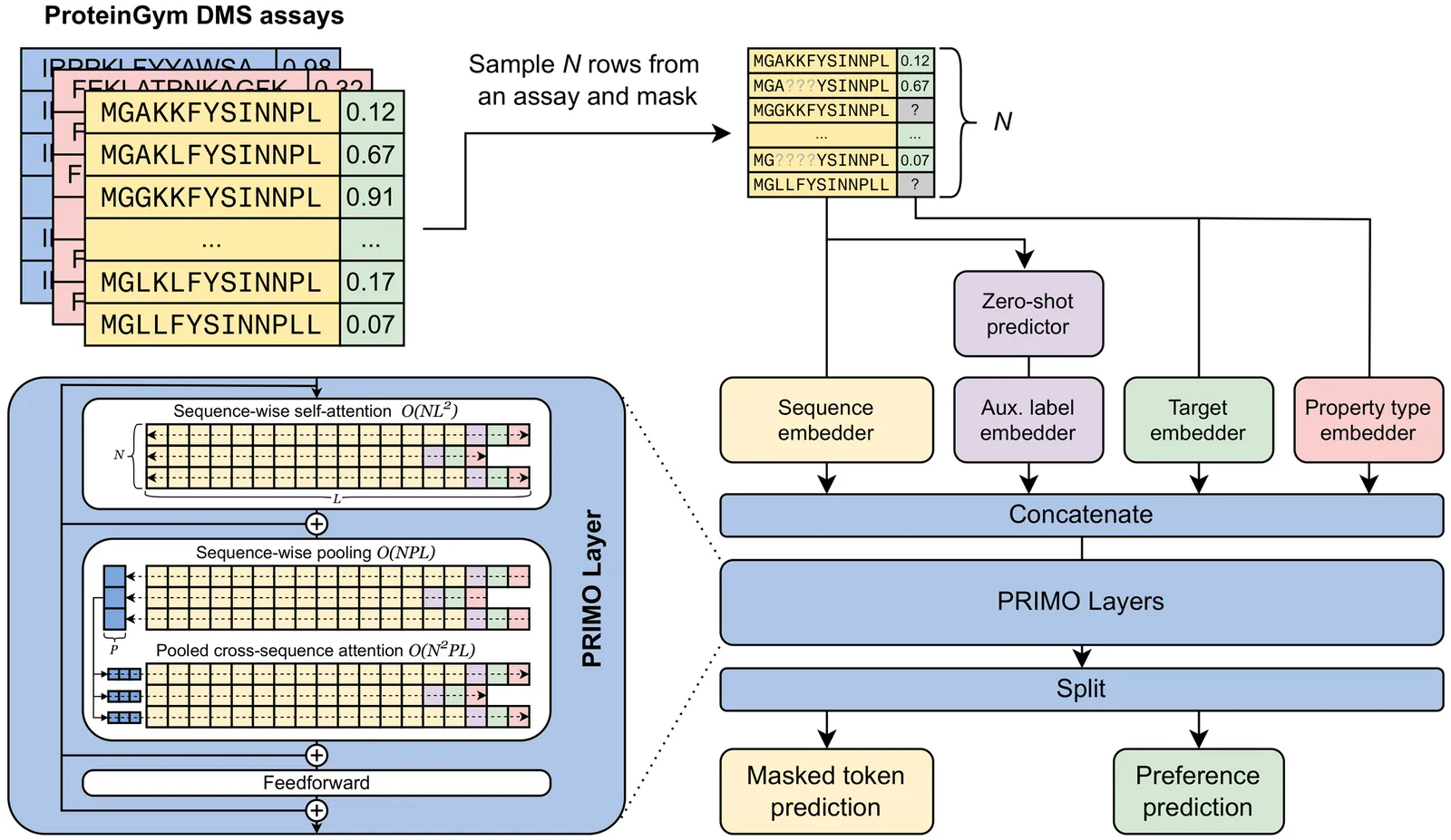 Accurately predicting protein fitness with minimal experimental data is a persistent challenge in protein engineering. We introduce PRIMO (PRotein In-context Mutation Oracle), a transformer-based framework that leverages in-context learning and test-time training to adapt rapidly to new proteins and assays without large task-specific datasets. By encoding sequence information, auxiliary zero-shot predictions, and sparse experimental labels from many assays as a unified token set in a pre-training masked-language modeling paradigm, PRIMO learns to prioritize promising variants through a preference-based loss function. Across diverse protein families and properties-including both substitution and indel mutations-PRIMO outperforms zero-shot and fully supervised baselines. This work underscores the power of combining large-scale pre-training with efficient test-time adaptation to tackle challenging protein design tasks where data collection is expensive and label availability is limited.