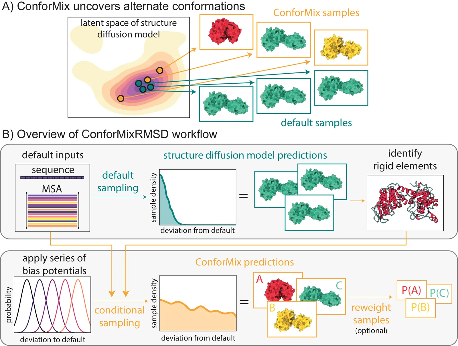 The function of biomolecules such as proteins depends on their ability to interconvert between a wide range of structures or "conformations." Researchers have endeavored for decades to develop computational methods to predict the distribution of conformations, which is far harder to determine experimentally than a static folded structure. We present ConforMix, an inference-time algorithm that enhances sampling of conformational distributions using a combination of classifier guidance, filtering, and free energy estimation. Our approach upgrades diffusion models -- whether trained for static structure prediction or conformational generation -- to enable more efficient discovery of conformational variability without requiring prior knowledge of major degrees of freedom. ConforMix is orthogonal to improvements in model pretraining and would benefit even a hypothetical model that perfectly reproduced the Boltzmann distribution. Remarkably, when applied to a diffusion model trained for static structure prediction, ConforMix captures structural changes including domain motion, cryptic pocket flexibility, and transporter cycling, while avoiding unphysical states. Case studies of biologically critical proteins demonstrate the scalability, accuracy, and utility of this method.