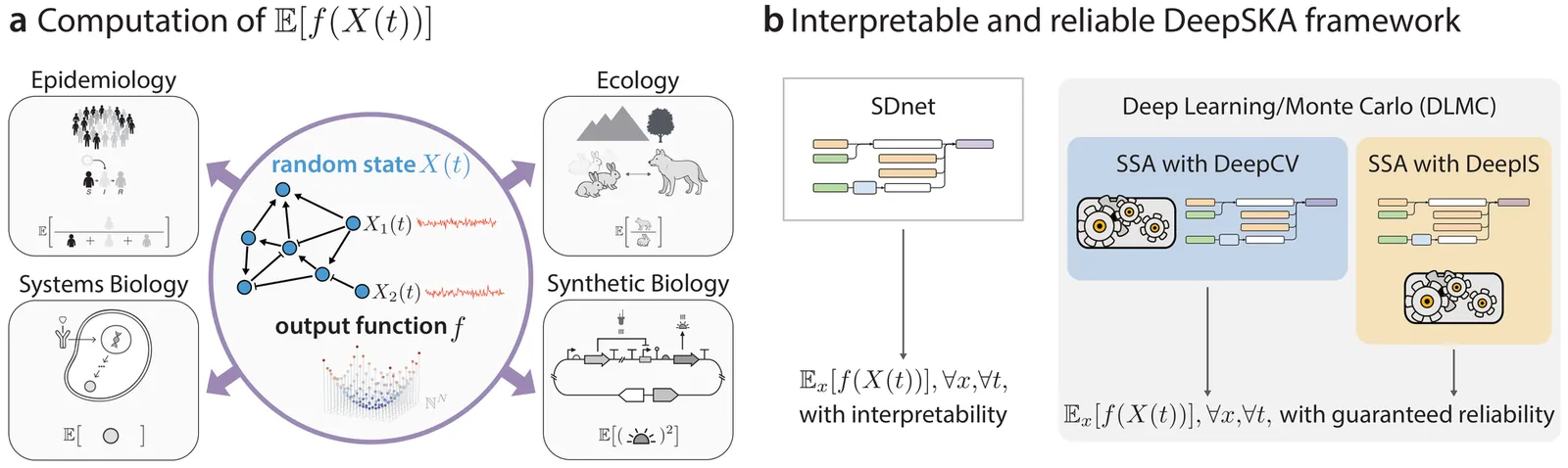 Stochastic Reaction Networks (SRNs) are a fundamental modeling framework for systems ranging from chemical kinetics and epidemiology to ecological and synthetic biological processes. A central computational challenge is the estimation of expected outputs across initial conditions and times, a task that is rarely solvable analytically and becomes computationally prohibitive with current methods such as Finite State Projection or the Stochastic Simulation Algorithm. Existing deep learning approaches offer empirical scalability, but provide neither interpretability nor reliability guarantees, limiting their use in scientific analysis and in applications where model outputs inform real-world decisions. Here we introduce DeepSKA, a neural framework that jointly achieves interpretability, guaranteed reliability, and substantial computational gains. DeepSKA yields mathematically transparent representations that generalise across states, times, and output functions, and it integrates this structure with a small number of stochastic simulations to produce unbiased, provably convergent, and dramatically lower-variance estimates than classical Monte Carlo. We demonstrate these capabilities across nine SRNs, including nonlinear and non-mass-action models with up to ten species, where DeepSKA delivers accurate predictions and orders-of-magnitude efficiency improvements. This interpretable and reliable neural framework offers a principled foundation for developing analogous methods for other Markovian systems, including stochastic differential equations.