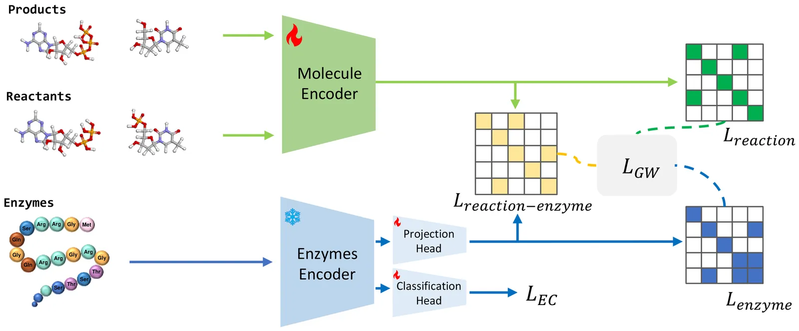 Enzymes are crucial catalysts that enable a wide range of biochemical reactions. Efficiently identifying specific enzymes from vast protein libraries is essential for advancing biocatalysis. Traditional computational methods for enzyme screening and retrieval are time-consuming and resource-intensive. Recently, deep learning approaches have shown promise. However, these methods focus solely on the interaction between enzymes and reactions, overlooking the inherent hierarchical relationships within each domain. To address these limitations, we introduce FGW-CLIP, a novel contrastive learning framework based on optimizing the fused Gromov-Wasserstein distance. FGW-CLIP incorporates multiple alignments, including inter-domain alignment between reactions and enzymes and intra-domain alignment within enzymes and reactions. By introducing a tailored regularization term, our method minimizes the Gromov-Wasserstein distance between enzyme and reaction spaces, which enhances information integration across these domains. Extensive evaluations demonstrate the superiority of FGW-CLIP in challenging enzyme-reaction tasks. On the widely-used EnzymeMap benchmark, FGW-CLIP achieves state-of-the-art performance in enzyme virtual screening, as measured by BEDROC and EF metrics. Moreover, FGW-CLIP consistently outperforms across all three splits of ReactZyme, the largest enzyme-reaction benchmark, demonstrating robust generalization to novel enzymes and reactions. These results position FGW-CLIP as a promising framework for enzyme discovery in complex biochemical settings, with strong adaptability across diverse screening scenarios.