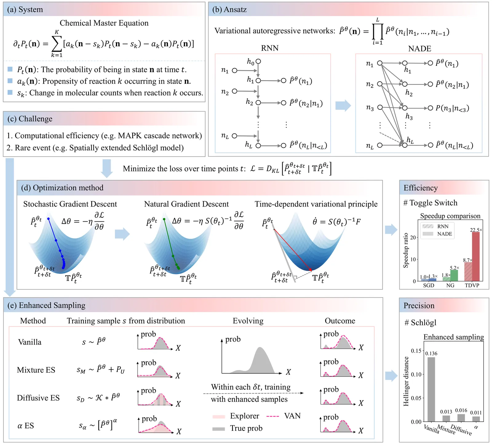 Chemical reaction networks are widely used to model stochastic dynamics in chemical kinetics, systems biology and epidemiology. Solving the chemical master equation that governs these systems poses a significant challenge due to the large state space exponentially growing with system sizes. The development of autoregressive neural networks offers a flexible framework for this problem; however, its efficiency is limited especially for high-dimensional systems and in scenarios with rare events. Here, we push the frontier of neural-network approach by exploiting faster optimizations such as natural gradient descent and time-dependent variational principle, achieving a 5- to 22-fold speedup, and by leveraging enhanced-sampling strategies to capture rare events. We demonstrate reduced computational cost and higher accuracy over the previous neural-network method in challenging reaction networks, including the mitogen-activated protein kinase (MAPK) cascade network, the hitherto largest biological network handled by the previous approaches of solving the chemical master equation. We further apply the approach to spatially extended reaction-diffusion systems, the Schlögl model with rare events, on two-dimensional lattices, beyond the recent tensor-network approach that handles one-dimensional lattices. The present approach thus enables efficient modeling of chemical reaction networks in general.