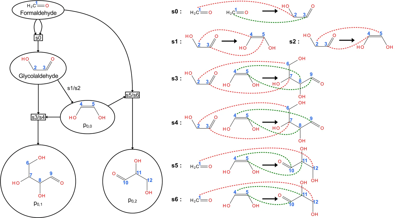 Atom tracing is essential for understanding the fate of labeled atoms in biochemical reaction networks, yet existing computational methods either simplify label correlations or suffer from combinatorial explosion. We introduce a saturation-based framework for enumerating labeling patterns that directly operates on atom-atom maps without requiring flux data or experimental measurements. The approach models reaction semantics using Kleisli morphisms in the powerset monad, allowing for compositional propagation of atom provenance through reaction networks. By iteratively saturating all possible educt combinations of reaction rules, the method exhaustively enumerates labeled molecular configurations, including multiplicities and reuse. Allowing arbitrary initial labeling patterns - including identical or distinct labels - the method expands only isotopomers reachable from these inputs, keeping the configuration space as small as necessary and avoids the full combinatorial growth characteristic of previous approaches. In principle, even every atom could carry a distinct identifier (e.g., tracing all carbon atoms individually), illustrating the generality of the framework beyond practical experimental limitations. The resulting template instance hypergraph captures the complete flow of atoms between compounds and supports projections tailored to experimental targets. Customizable labeling sets significantly reduce generated network sizes, providing efficient and exact atom traces focused on specific compounds or available isotopes. Applications to the tricarboxylic acid cycle, and glycolytic pathways demonstrate that the method fully automatically reproduces known labeling patterns and discovers steady-state labeling behavior. The framework offers a scalable, mechanistically transparent, and generalizable foundation for isotopomer modeling and experiment design.