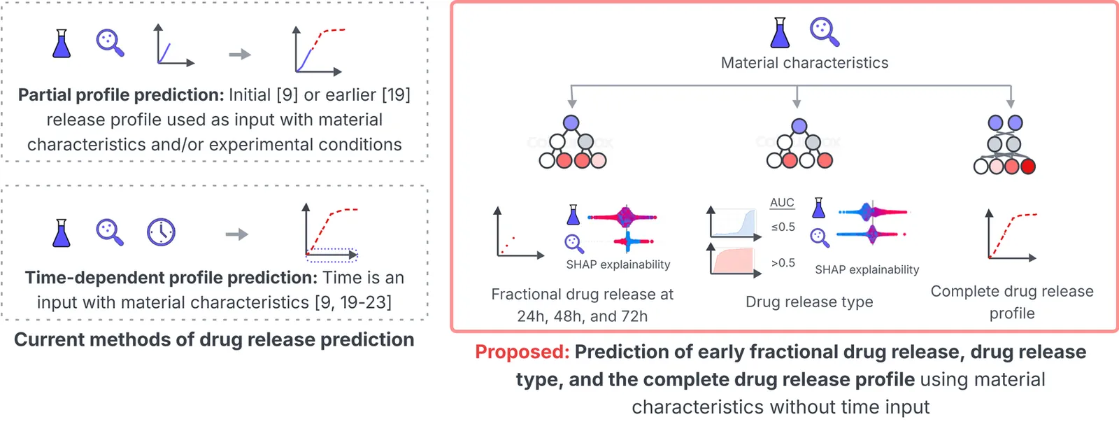 Polymer-based long-acting injectables (LAIs) have transformed the treatment of chronic diseases by enabling controlled drug delivery, thus reducing dosing frequency and extending therapeutic duration. Achieving controlled drug release from LAIs requires extensive optimization of the complex underlying physicochemical properties. Machine learning (ML) can accelerate LAI development by modeling the complex relationships between LAI properties and drug release. However, recent ML studies have provided limited information on key properties that modulate drug release, due to the lack of custom modeling and analysis tailored to LAI data. This paper presents a novel data transformation and explainable ML approach to synthesize actionable information from 321 LAI formulations by predicting early drug release at 24, 48, and 72 hours, classification of release profile types, and prediction of complete release profiles. These three experiments investigate the contribution and control of LAI material characteristics in early and complete drug release profiles. A strong correlation (>0.65) is observed between the true and predicted drug release in 72 hours, while a 0.87 F1-score is obtained in classifying release profile types. A time-independent ML framework predicts delayed biphasic and triphasic curves with better performance than current time-dependent approaches. Shapley additive explanations reveal the relative influence of material characteristics during early and for complete release which fill several gaps in previous in-vitro and ML-based studies. The novel approach and findings can provide a quantitative strategy and recommendations for scientists to optimize the drug-release dynamics of LAI. The source code for the model implementation is publicly available.